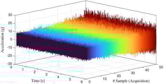This study focuses on the analysis of the raw radial vibration signals from the high-speed shaft bearing, where an inner race defect was confirmed through inspection. As shown in the time-domain plots of the signals (see Figure 9), the dataset exhibits a progressive increase in amplitude levels as the number of acquisitions (one for each day) grows.