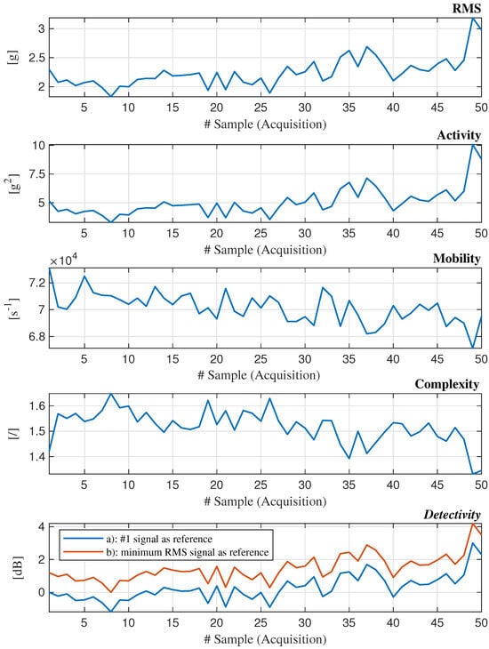Regarding Detectivity, two cases are presented: (a) The values were computed using the Hjorth parameters of the first signal in the collection as the reference, based on the reasonable assumption that the bearing’s health condition was the best during that acquisition compared to all the others; (b) The values were computed using as reference the signal with the lowest RMS value, which, as expected, occurs chronologically among the earliest in the sequence.