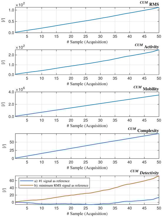 It can be observed that the trends of RMS, Activity, and Detectivity are similar, as are those of Mobility and Complexity. The first group already provides useful information: their approximately increasing trend confirms what is also evident from the time-domain signal plots. However, it is the behavior of the cumulants computed for each of the analyzed metrics (see Figure 11) that reveals additional insights: with the exception of Detectivity computed using the first signal as reference, the remaining parameters exhibit a trend that is well approximated by a linear progression. As is intuitively evident, a purely linear trend implies the absence of significant variations in the behavior of the underlying metric. Upon closer inspection, however, the trends of Mobility and Complexity appear, ictu oculi, indistinguishable from linear segments. As such, they provide no additional information. Likewise, Detectivity in case (a) can be disregarded due to its non-monotonic behavior. Therefore, it is appropriate to focus the analysis on the remaining three plots, e.g., RMS, Activity, and Detectivity (b).