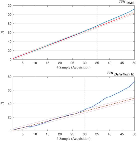 On closer inspection, for zero-mean signals, it is well known that the Activity, i.e., the variance of the signal, is equal to the square of the RMS. Therefore, we can consider only the latter in comparison with the Detectivity. As shown in Figure 12, the trends are plotted alongside reference lines (dashed red), which were constructed by using, as the unit step for the ordinates, the absolute difference between the first two cumulant values. Additionally, boundary lines (solid light gray) are plotted according to the shift of relative to the reference line: the value was selected as sufficient to encompass deviations from linearity that are not indicative of damage (see the Detectivity plot for the period between approximately day 7 and day 15). This allows us to observe, through the vertical lines (dotted black) intersecting the curves at the points where they exit the rails (which can be regarded as the point of incipient anomaly), that in the case of Detectivity, anomaly is detected earlier, on the 30th day of testing, whereas, using the same criterion, the RMS sees the issue five days later.