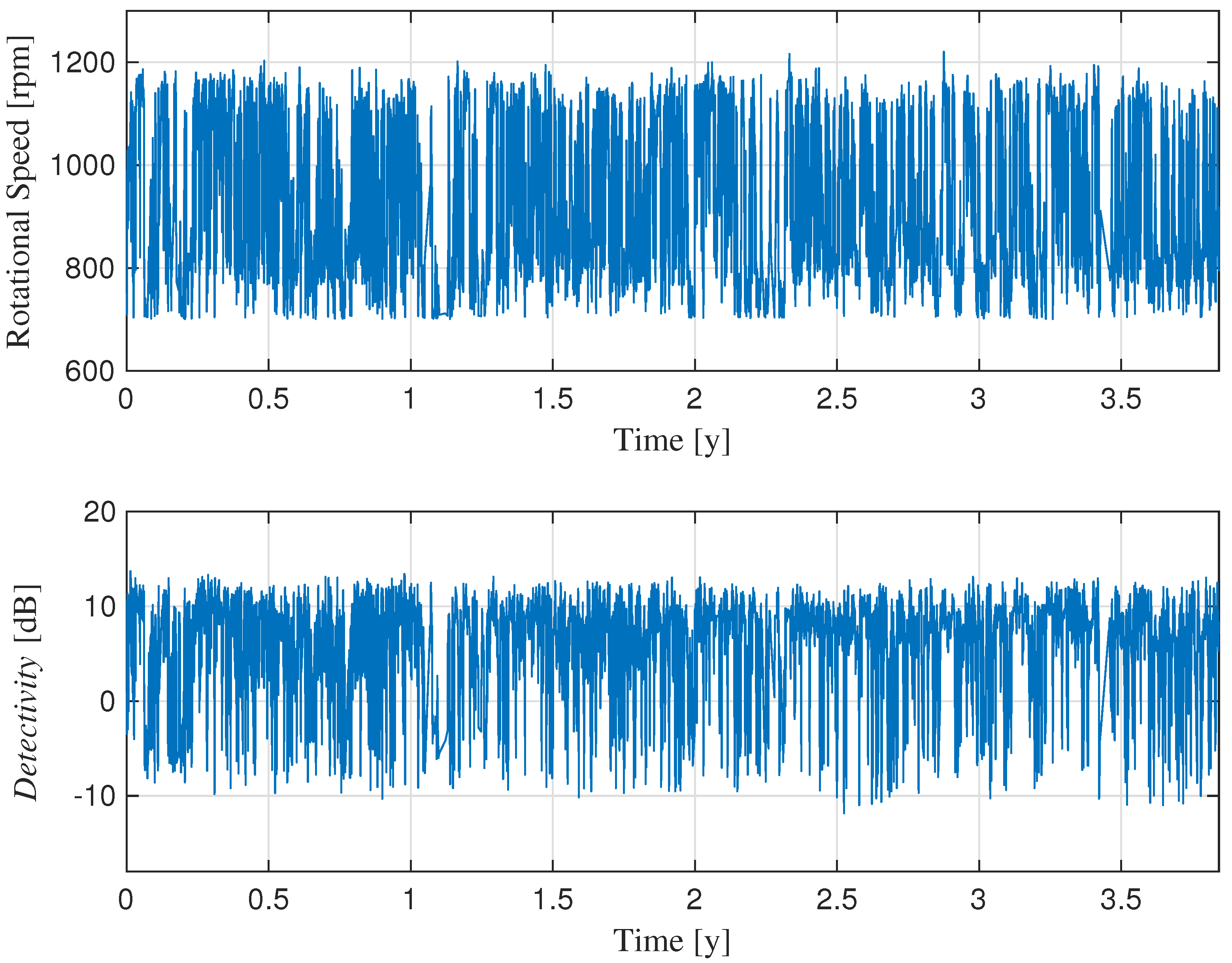 As an illustrative example, Figure 1 presents the speed profile of Turbine 1 during the test period, showing continuous fluctuations between 700 and 1200 rpm. The corresponding Detectivity values (as defined in Equation (9)) are also shown, using the first acquisition in the series as a reference.