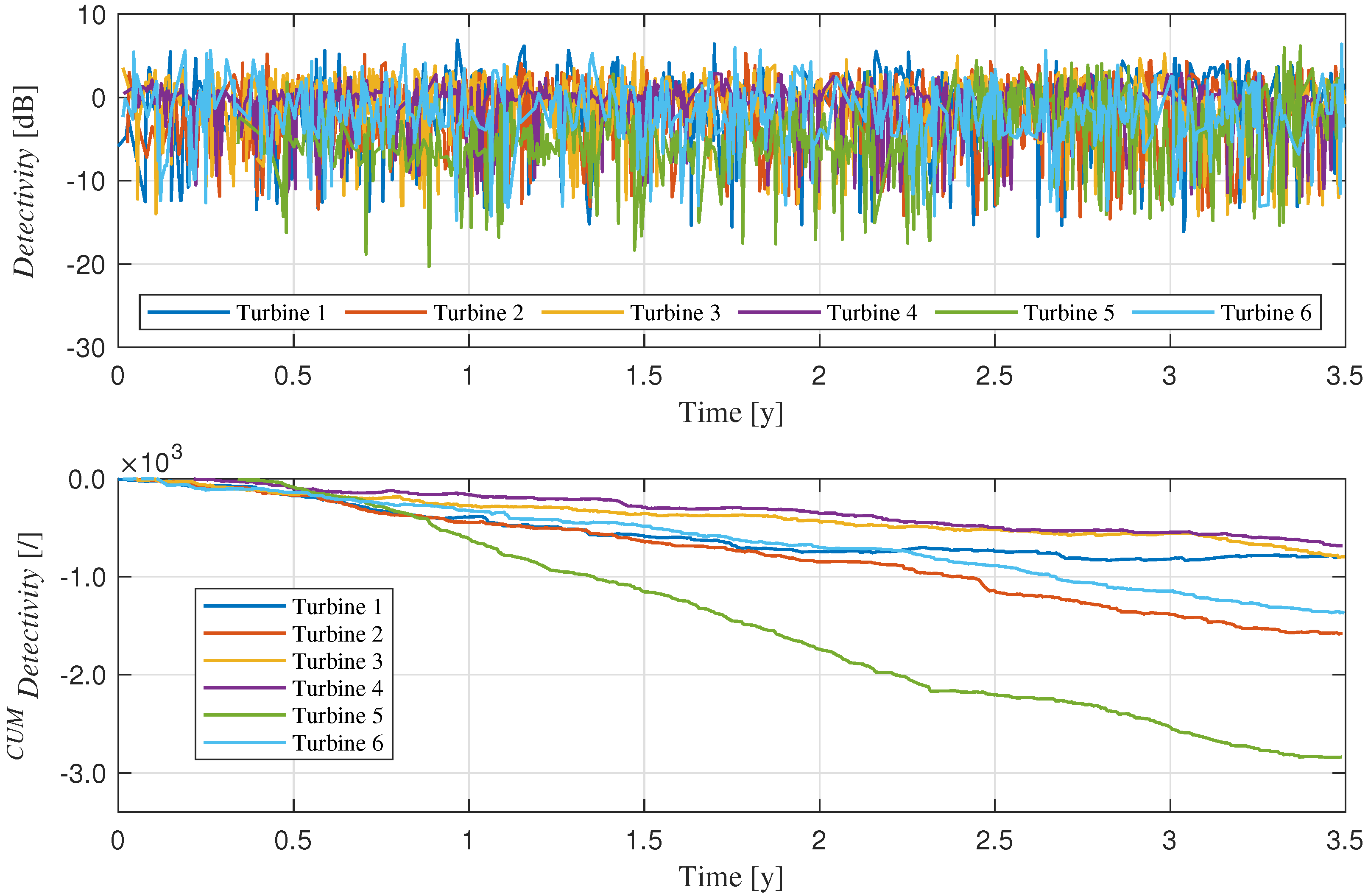 Detectivity has been successfully applied to both simulated and real-world datasets, to track rolling bearing degradation [26] and, in a preliminary work, for condition monitoring of wind turbines [27], demonstrating its robustness, sensitivity, and suitability for real-time condition monitoring: it is a statistical parameter easy to apply and effective, offering a practical alternative to more complex signal analysis techniques and machine learning algorithms, which may lead to similar results with significantly greater effort.