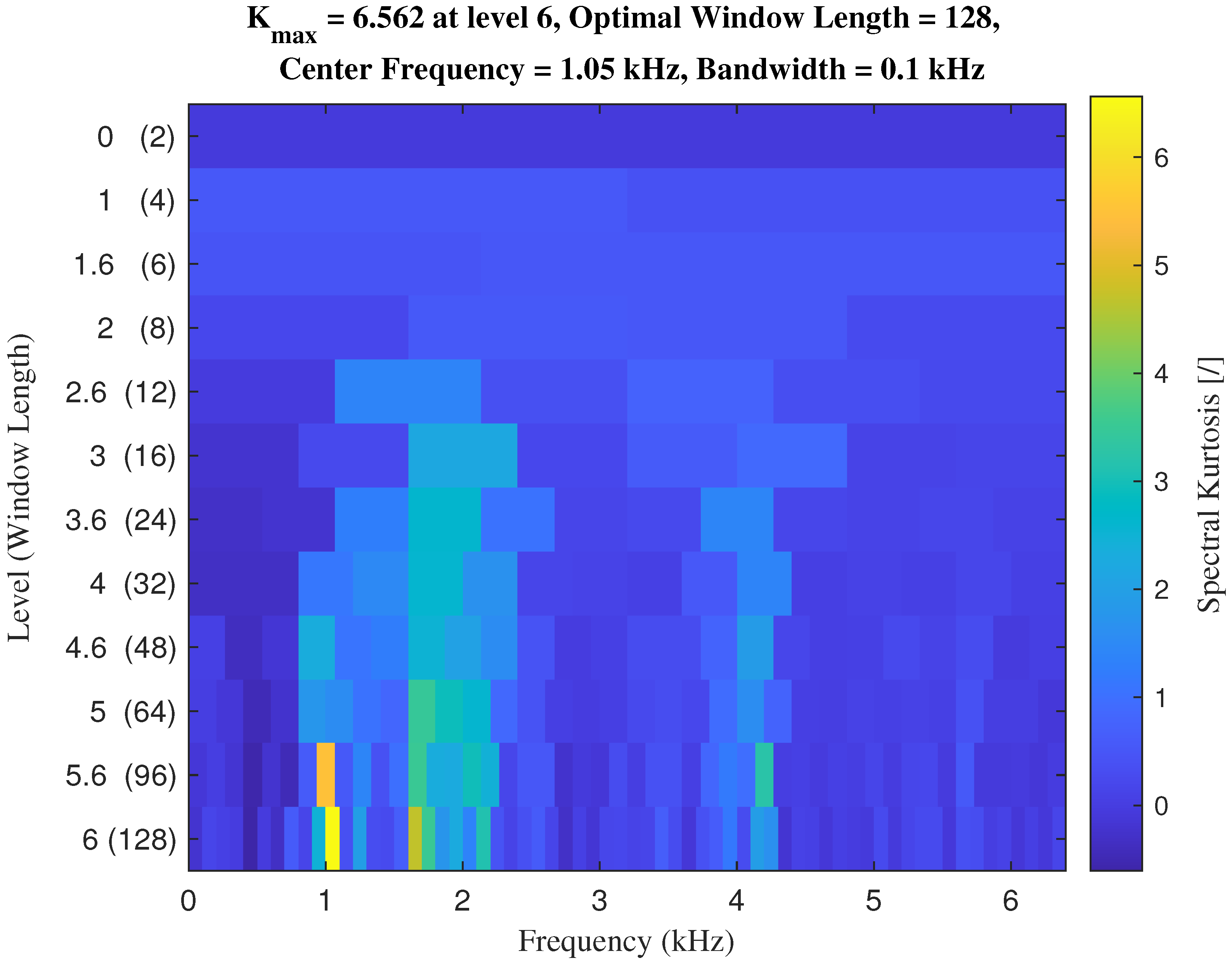 Figure 5. Fast Kurtogram of the first data sample related to the selected speed range, Turbine 1.