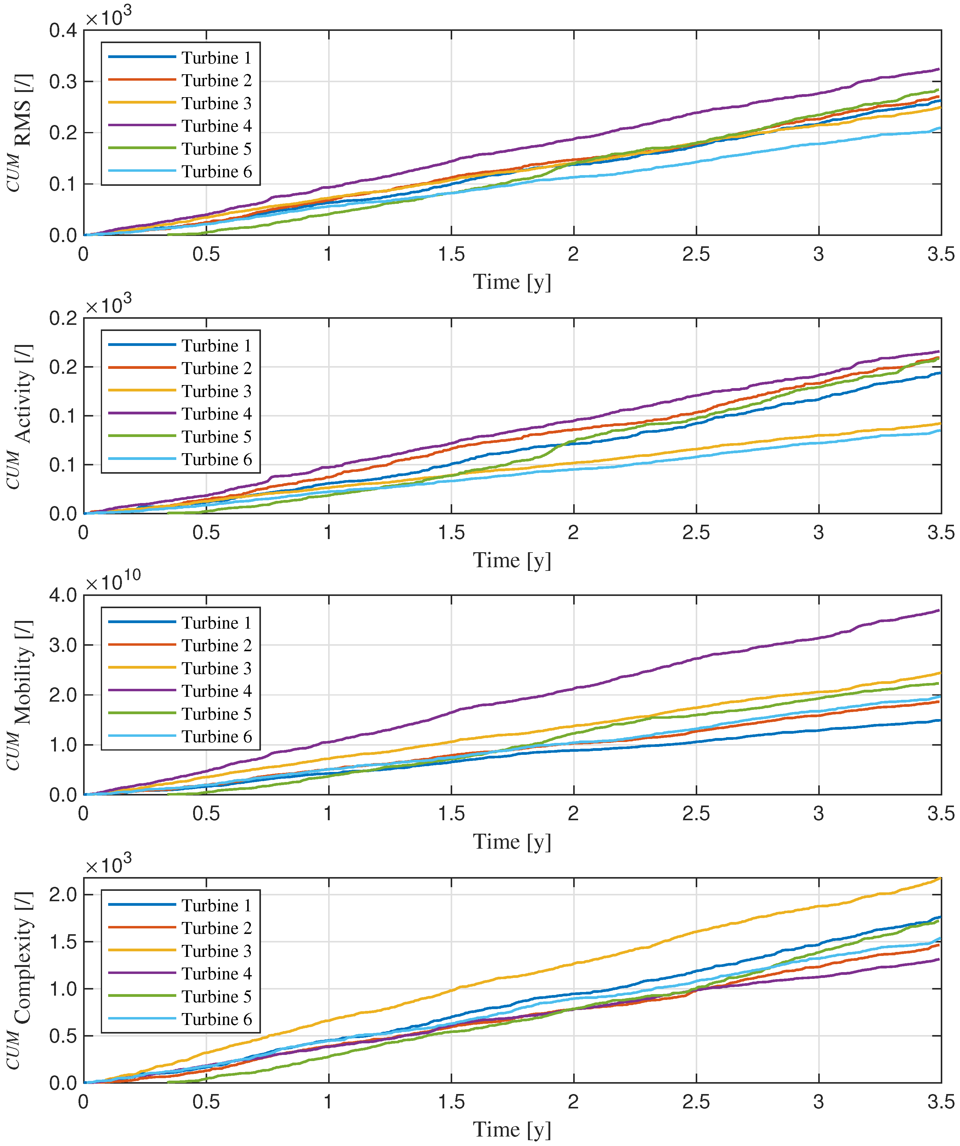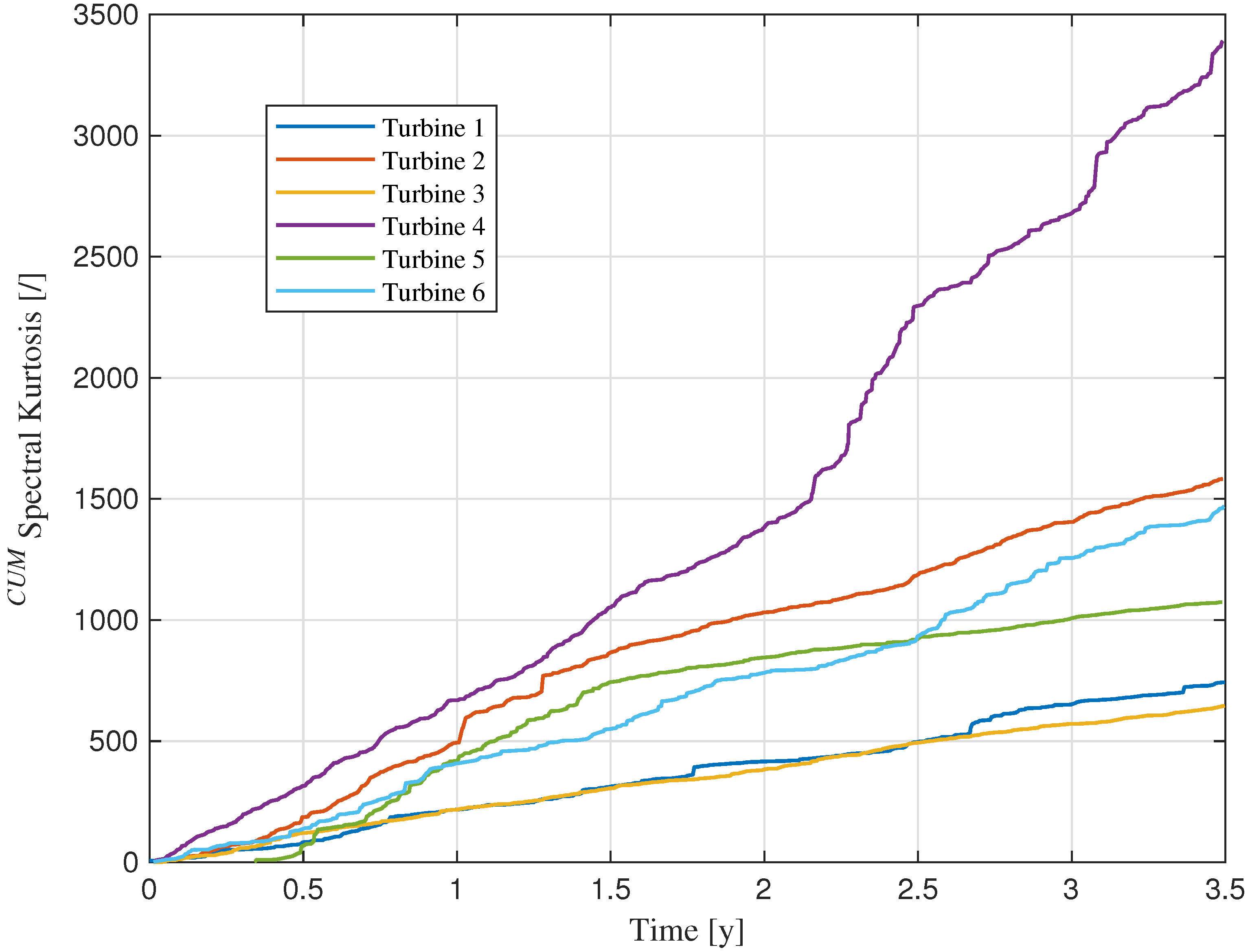 Figure 7. Behavior of cumulative Spectral Kurtosis over the monitoring period for each turbine.