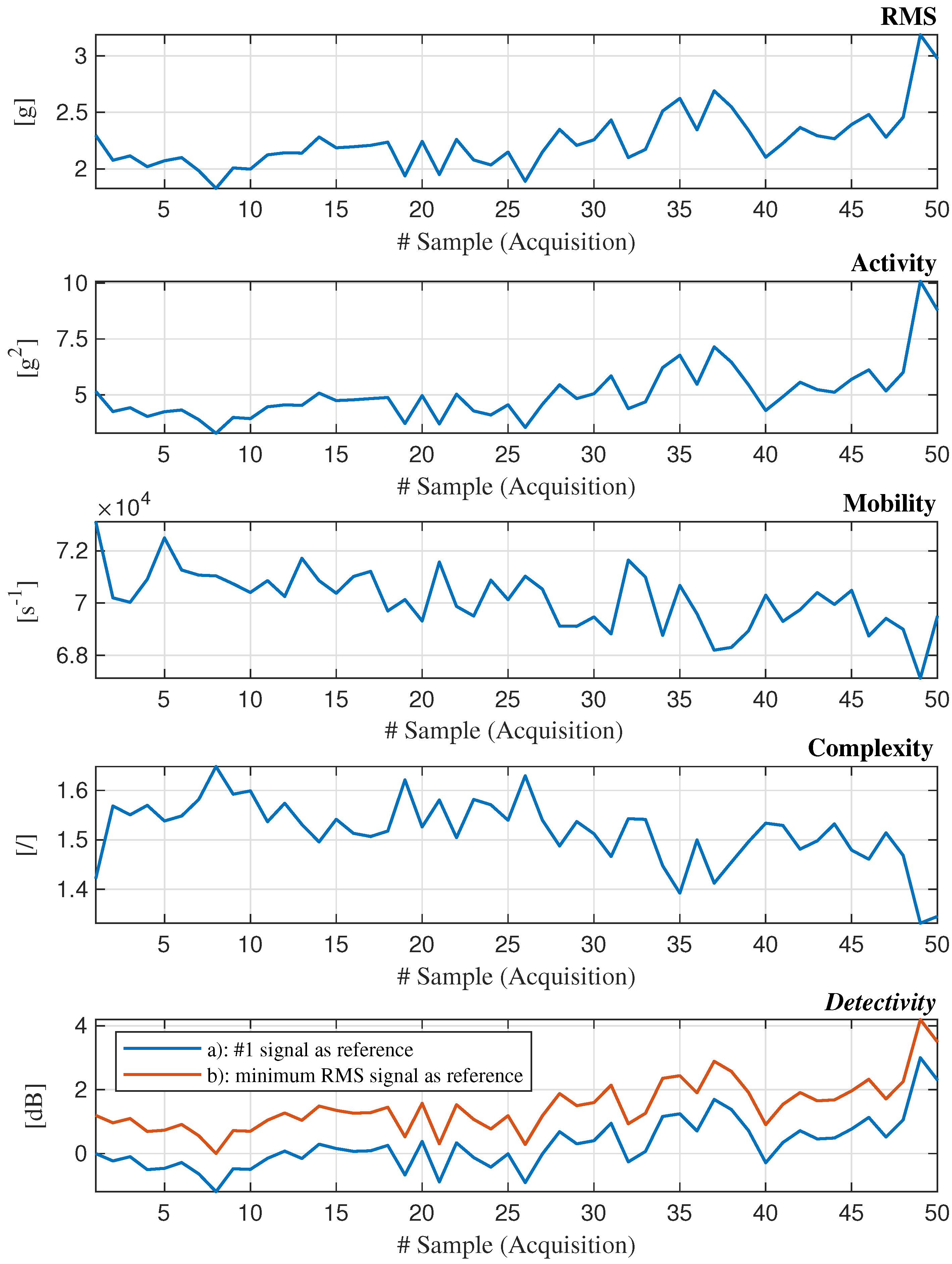The need for quantitative descriptors of biomedical signals, particularly EEG traces, has long motivated the development of compact and interpretable parameters. Until the 1960s, traditional approaches to signal characterization predominantly relied on transforming the amplitude-time representation into the frequency domain, most commonly through Fourier analysis. Although such methods yield valuable spectral insights, they inherently discard phase information and impose a sinusoidal basis that may not accurately reflect the underlying generative mechanisms of the signal. These limitations highlight the need for compact and interpretable alternative descriptors that can capture the essential morphological features of a signal without relying on assumptions about its spectral composition. In his seminal work, Hjorth [25] proposed an alternative framework grounded in the time domain, emphasizing that a purely descriptive system based on temporal characteristics may offer a more physiologically relevant representation. He distinguished between two fundamental objectives in signal analysis: (a) the general characterization of signal morphology and (b) the detection of specific, predefined patterns. Hjorth’s parameters were designed to address the first one, providing a statistical summary of signal shape without requiring assumptions about underlying frequency components. Rather than relying on detailed histograms or zero-crossing intervals, Hjorth’s method focuses on the standard deviations of the signal and its derivatives. This leads to three scalar parameters named Activity, Mobility, and Complexity that together capture the variability of the amplitude, the average frequency content, and the complexity of the waveform of the signal. These parameters are not only computationally efficient but also robust to transformations, preserving their interpretability across both time and frequency domains. This time-domain approach offers a bridge between intuitive physical interpretations and rigorous statistical foundations, enabling real-time, low-complexity analysis of signals such as EEG, vibration, or other biomedical and mechanical data streams. To further reinforce the theoretical grounding of these parameters, Hjorth demonstrated that Activity, Mobility, and Complexity can also be derived from the statistical moments of the signal power spectrum. Specifically, Activity corresponds to the zeroth-order moment, representing total signal power; Mobility relates to the second-order moment, capturing the spread of frequency content; and Complexity involves a normalized ratio of higher-order moments, reflecting the signal’s deviation from sinusoidal regularity. This dual-domain formulation ensures that Hjorth’s parameters retain their descriptive power whether computed directly in the time domain or inferred from spectral characteristics. Building on this foundation, Cocconcelli et al. [26] proposed the Detectivity, a scalar index that fuses the three Hjorth’s parameters into a unified metric. Defined as a weighted combination of Activity, Mobility, and Complexity (typically expressed on a decibel scale relative to a reference condition), Detectivity enhances sensitivity to signal changes and facilitates long-term condition monitoring. Its robustness across domains and computational efficiency make it particularly suitable for applications in fault detection and lifecycle tracking of dynamic systems.