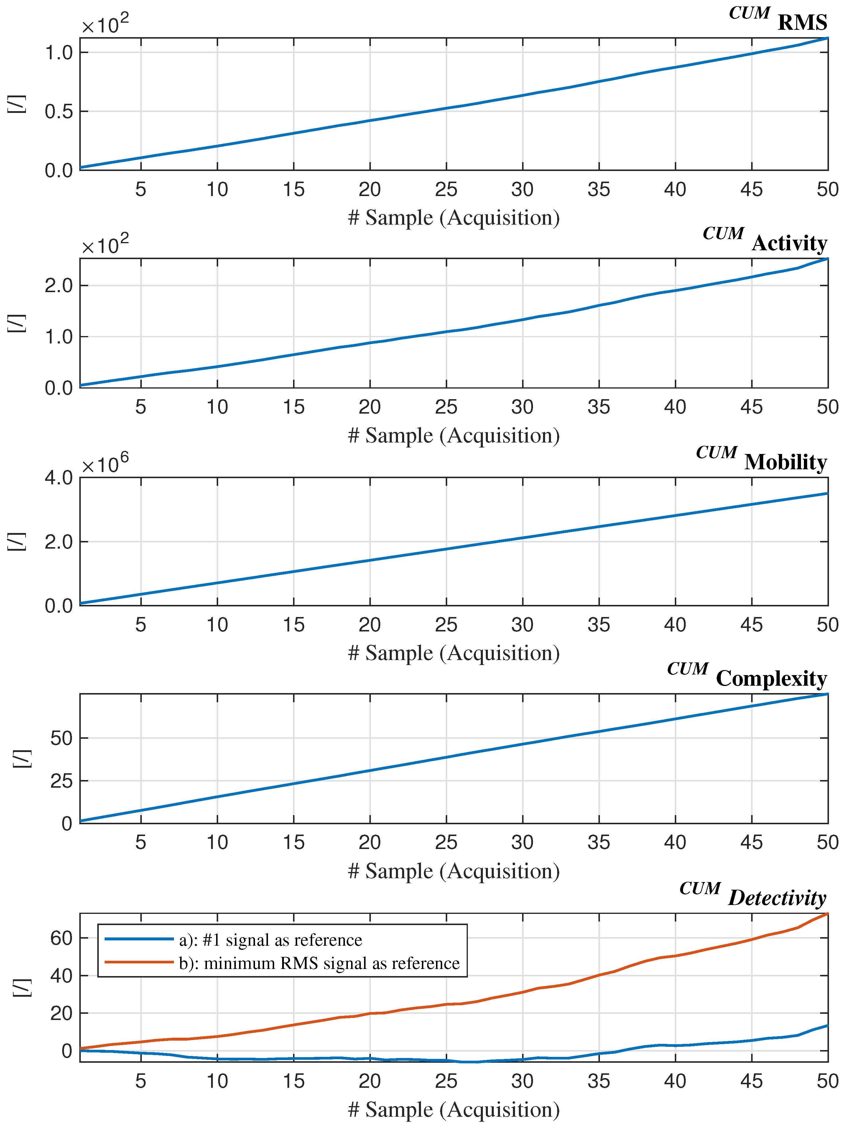 It is particularly useful for identifying transitions in operating regimes or shifts in dominant frequency components. Since it is normalized via Activity, Mobility is invariant to amplitude scaling, making it robust for a comparative analysis across different signal magnitudes.