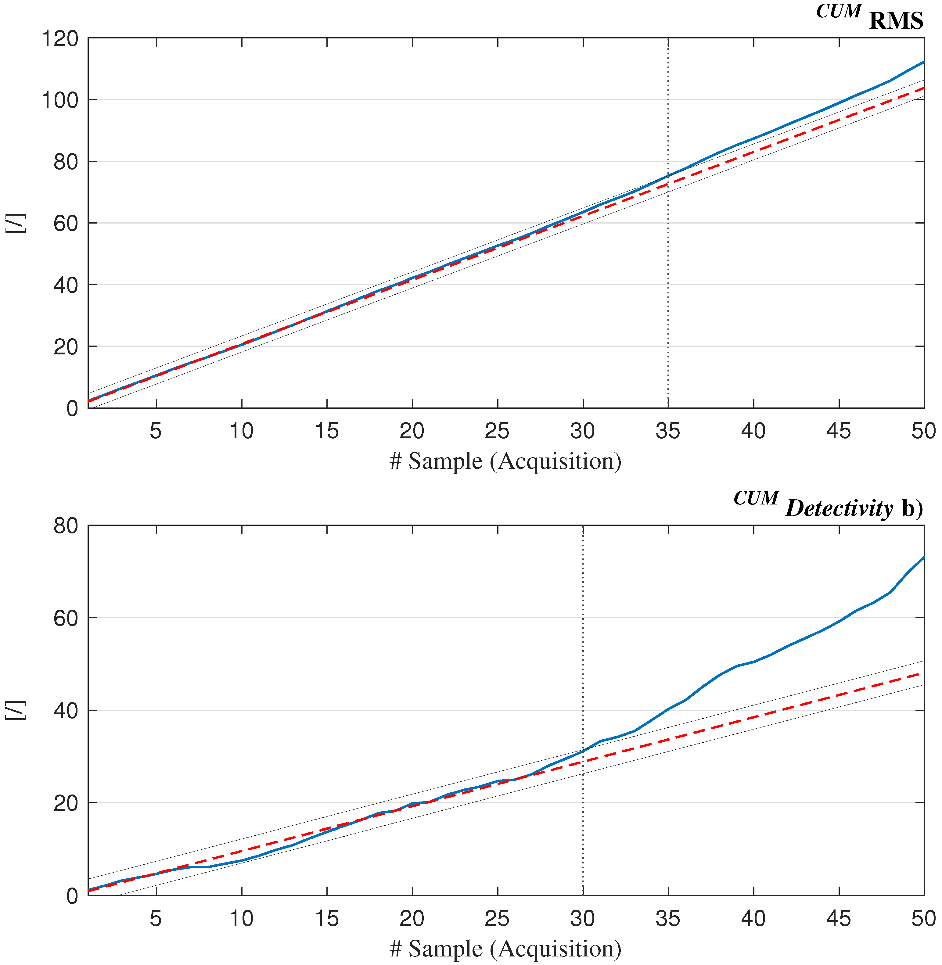 Figure 12. Detailed view of the behaviour of cumulative RMS and Detectivity values plotted alongside the reference lines.