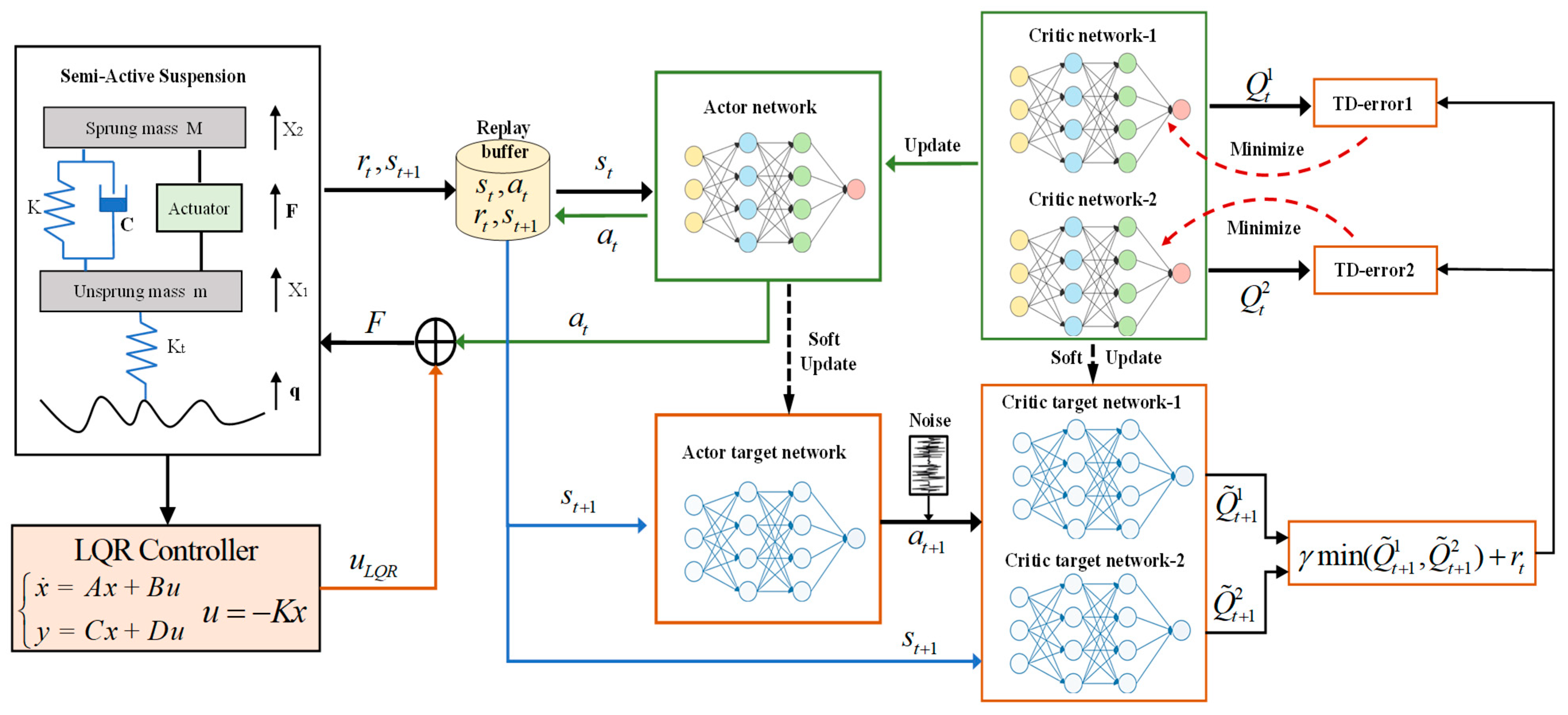 - An improved TD3 model integrating residual connections and LSTM layers is proposed to enhance training stability and better capture the dynamic and inertial characteristics of the suspension system.