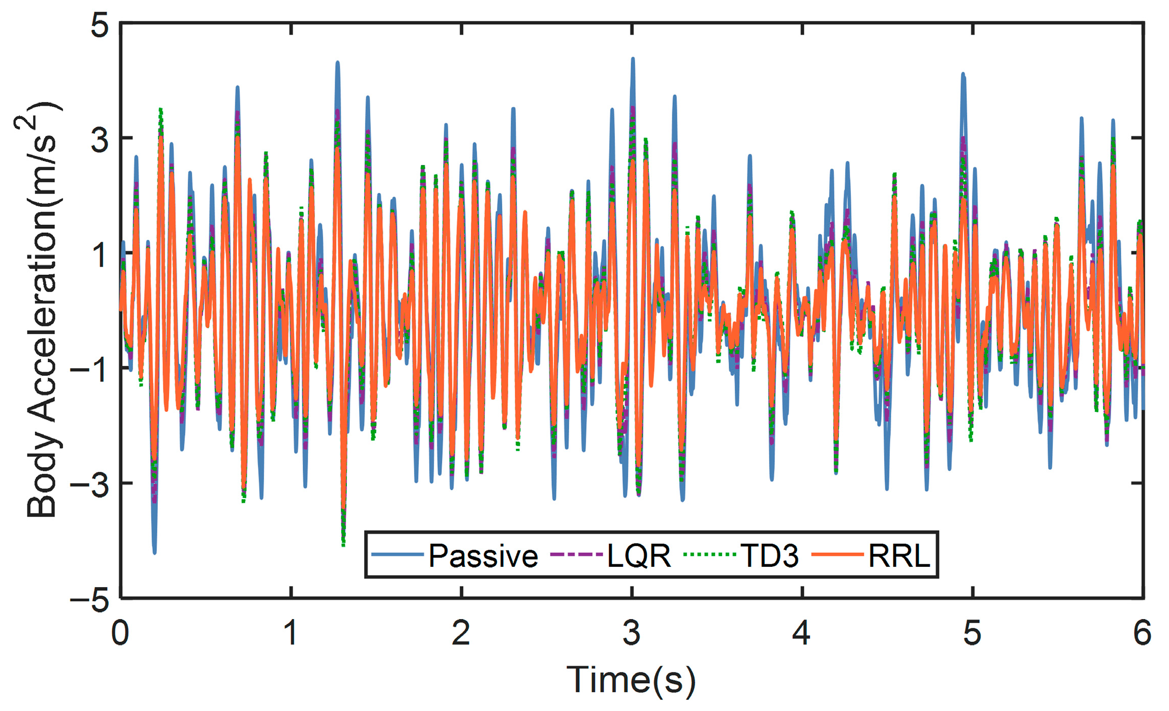 - A residual reinforcement learning (RRL) control method based on policy learning is proposed to enhance the control performance of the suspension system. This method combines a LQR controller to provide the baseline actuator force and incorporates reinforcement learning to generate a corrective control input, thereby improving the system’s adaptability and disturbance-rejection capability.