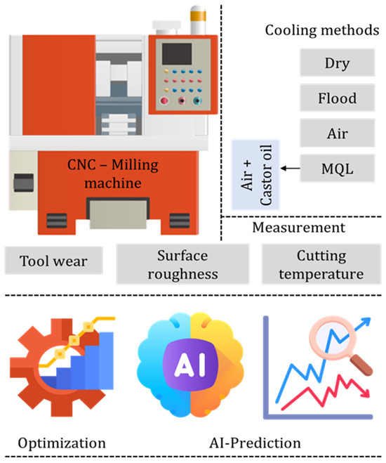 Four distinct environmental conditions were employed to study the machinability of the fabricated AlSi10Mg to evaluate its performance. No external coolant or lubrication setup was employed for dry cutting. Although dry machining is environmentally friendly, it leads to increased cutting temperature and wear. A ratio of one part oil to twenty parts water was utilized to prepare the flood coolant. Continuous supply of an emulsion-based coolant was used in the cutting area to dissipate heat and lower friction. To evaluate the performance of the machinability, air (chilled air) was used as a coolant. A vortex tube was used to provide chilled air for cooling, and cold air was produced from compressed air without the need for external power. Cao was used as the lubricant for MQL, and an MQL setup was utilized to spray the oil in small droplets close to the cutting area. Cao lowers cutting temperatures, improves surface smoothness, and lessens the friction at the tool-W/p contact due to its greater lubricating qualities and biodegradability. Throughout the MQL operation, a pressure of 4 bar was maintained.