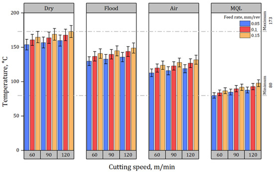Cutting temperature under distinct speed–feed combinations and environments.
