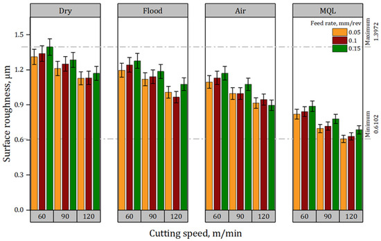 Surface roughness under distinct speed–feed combinations and environments.