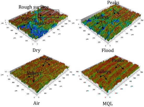 The surface attributes of the machined AM-AlSi10Mg under various cooling conditions were examined in this study using 3D surface plots (Figure 5). A comparative evaluation of the machined surface’s uniformity, waviness, and roughness across different cooling techniques is made possible by these surface plots, which offer an illustrative representation of the surface topography. MQL had the most consistent surface finish and the least number of peaks and valleys of all the cooling conditions. Cao’s efficient C/L properties lower the friction and heat generation at the tool-W/p contact region. MQL creates a protective layer that minimizes tool wear and reduces imperfections on the machined surface, as addressed before in this investigation. On the other hand, greater tool wear and excess heat generation caused higher peaks and valleys under dry and flood conditions. Surface quality was enhanced by air cooling in contrast to dry machining. The capacity of MQL to improve surface integrity was confirmed by the 3D surface plots, which showed a more uniform surface with lesser peaks and valleys.