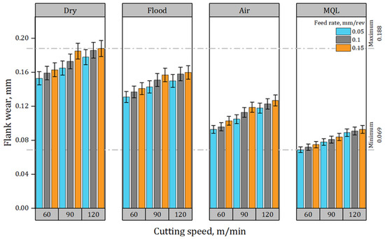 Flank wear under distinct speed–feed combinations and environments.