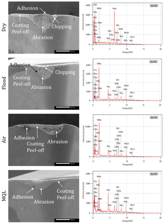 Figure 7 presents the SEM images of the flank side at a Vc of 120 m/min and a fr of 0.15 mm/rev. The combined impacts of high friction, heat stresses, and mechanical wear processes resulted in adhesion, abrasion, coating peel-off, and chipping in both dry and flood conditions. Because there is no lubrication or cooling during dry machining, the cutting area temperature rises significantly, increasing tool-W/p contact and promoting a strong adhesive connection between the W/p material and the tool surface. Material is transferred onto the tool because of this adhesion, eventually creating a BUE that eventually separates and leads to uneven tool wear. Moreover, excessive heat buildup weakens the coating and causes it to peel off; mechanical and thermal stresses produce localized material fracture that chips the cutting edge [29]. Introducing a constant coolant flow during flood machining helps to control the cutting area’s heat, minimizing tool thermal softening and minimizing adhesion and abrasive wear to some extent when compared to dry cutting. The tool material’s cyclic expansion and contraction is a contributing factor to coating peel-off. When the coolant suddenly cools down an overheated area, thermal cracking might result and cause a brittle cutting edge fracture, which is the reason for chipping. There was adhesion, abrasion, and peel-off of the coating under air and MQL conditions but no chipping. Even though convective heat loss happens to some extent during air cooling, it is not enough to significantly decrease the cutting temperature. On the other hand, MQL lessens direct metal-to-metal contact by supplying a fine mist of lubricating oil. In addition to reducing excessive heat accumulation, the thin lubricating film that forms between the tool and W/p lessens the severity of tool wear compared to other cutting conditions. Material transfer has taken place throughout the machining process, as evidenced by the presence of Fe as a parent element from AlSi10Mg under all cutting techniques. The main forces for material transfer are adhesion and diffusion wear processes. High friction and high cutting temperatures during dry and flood conditions promote diffusion between the W/p and tool, which results in material transfer. Even while lubrication lessens direct metal-to-metal contact under MQL conditions, the presence of Fe still verifies that some amount of diffusion has occurred.
