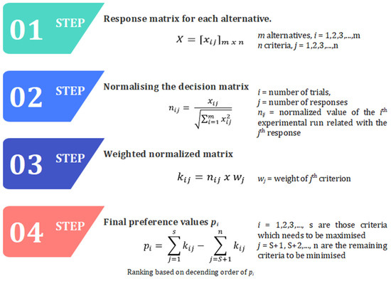 The MOORA (Multi-Objective Optimization on the basis of Ratio Analysis) method is a mathematical tool that helps in ranking the options where multiple outcomes are involved. This method considers both maximization and minimization objectives while computing the single preference value. This method has wide applications where performance evaluation, material selection, quality control, etc., are involved. Figure 8 presents the steps involved in the MOORA method.