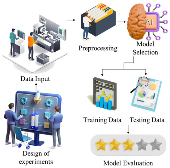 Incorporating machine learning (ML) into machining processes has become a game-changing approach due to the complicated and continuous interdependence between process factors and performance outcomes [30]. To minimize manufacturing costs, and increase product quality and working efficiency, this research uses ML techniques to provide accurate predictions that can accurately forecast tool life and surface roughness. Surface roughness directly affects machined part quality, whereas tool life affects resource utilization and production downtime [31]. ML-driven techniques encourage active decision-making and lower the dependency on expensive experiments. Figure 9 shows the process flow of ML in the machining process (https://www.vecteezy.com/). The ML models employed in this research work are explained below.