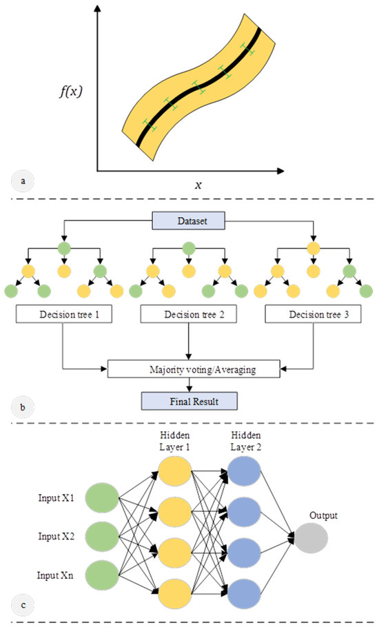 One kind of neural network utilized for tasks like regression and classification is MLP [34]. Figure 10c presents the schematic of MLP. The architecture includes an input layer, an output layer, and one or more hidden layers. Each input neuron in the network is supplied by some weights, which are then added up, and the result is passed through an activation function like a sigmoid or rectified linear unit (ReLU) to learn complex patterns. Backpropagation technique is used to train the network and modifies the weights to reduce the variations among predicted and actual outcomes. MLP is widely used because MLP can efficiently handle relationships that are not linear.