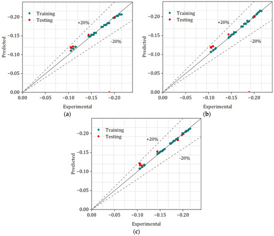 Testing and training of (a) GPR, (b) MLP, and (c) RF.