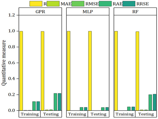Mean Absolute Error (MAE), Root Mean Squared Error (RMSE), Relative Absolute Error (RAE), and Root Relative Squared Error (RRSE) were employed to assess the performance of the three ML models—GPR, MLP, and RF—for both the training and testing stages. Figure 12 presents the quantitative analysis of different metrics. With an MAE of 0.0013 in training and 0.0018 in testing, MLP demonstrated greater precision and the lowest error rates in terms of MAE. GPR exhibited more errors with 0.0035 in training and 0.01 in testing, while RF recorded training MAEs of 0.0014 and 0.0093 (testing MAE), demonstrating MLP’s superior accuracy. With 0.0015 in training and 0.0021 in testing, MLP maintained the lowest RMSE values. RF came in second with 0.0017 in training and 0.0103 in testing, and GPR came in third with 0.0041 in training and 0.0108 in testing. The RAE values further showed MLP’s better performance, exhibiting the lowest RAE values of 4.14% in training and 3.91% in testing, whereas RF recorded 4.66% in training and 20.14% in testing. GPR demonstrated the greatest RAE values, showing 11.36% in training and 21.64% in testing. With training and testing values of 4.21% and 4.17%, respectively, MLP showed the lowest RRSE values. The highest RRSE value was obtained by GPR, with 11.45% in training and 21.73% in testing, while RF recorded 4.75% in training and 20.79% in testing. MLP was the most accurate algorithm for high-accuracy predictions in this data set, followed by RF with its reliable but slightly less exact predictions, and GPR, which was the least accurate due to its limits.