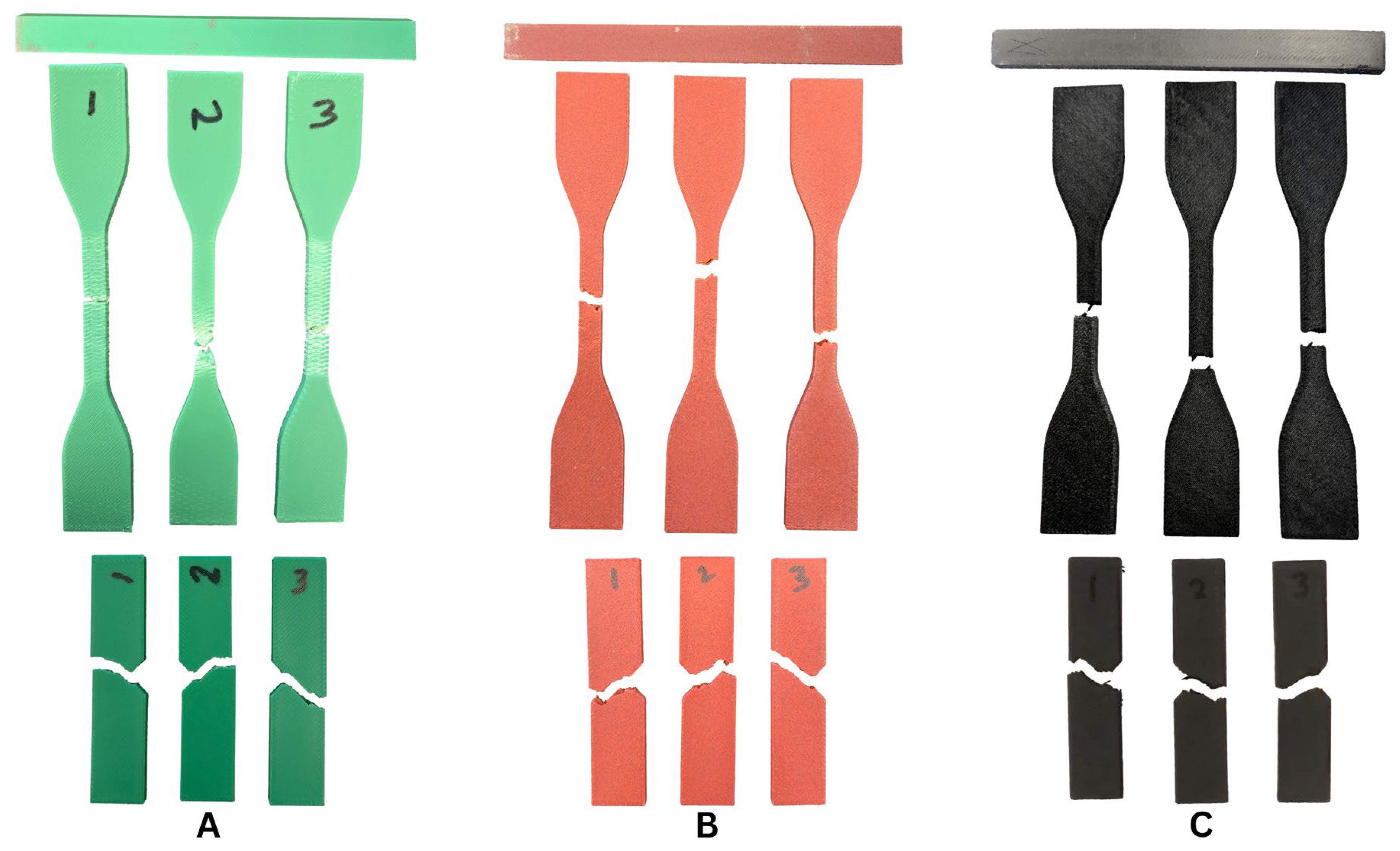 - Dimitrellou, S.; Iakovidis, I.; Psarianos, D.-R. Mechanical Characterization of Polylactic Acid, Polycarbonate, and Carbon Fiber-Reinforced Polyamide Specimens Fabricated by Fused Deposition Modeling. J. Mater. Eng. Perform. 2024, 33, 3613–3626. [Google Scholar] [CrossRef]