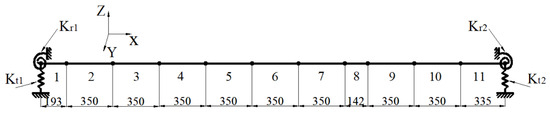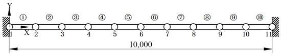 The length, outer diameter, and wall thickness of this pipeline are 10,000 × 880 × 40 mm with the modulus of elasticity and density taken as 1.85 × 1010 Pa and 7850 kg/m3, respectively. The steam pipeline is modeled by using ten 2D pipe elements and eleven nodes with two-DOFs (translation along Y axis and rotation around Z axis) allowed at each node. The lumped mass model of this steam pipeline is presented in Figure 1.