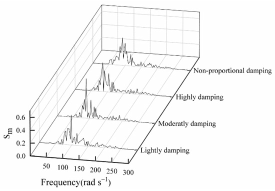 Sensitivity analysis conducted of updating parameters is needed before selecting the frequency points used for updating. The sensitivity of mf to VCEE, represented by Sm, at different damping distribution is shown in Figure 2. The sensitivity of Ek to VCEE, represented by SE, that is a function of its own value and frequency is presented in Figure 3.