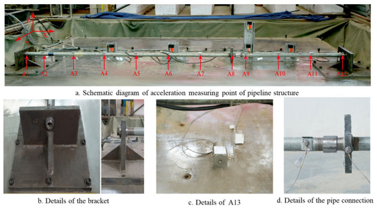 It can be observed that the two sets of data are in close agreement, indicating that the performance of the shaking table and the accuracy of the accelerometers used in this experiment generally meet the research requirements. The horizontal artificial seismic wave was applied to the pipeline by shaking table, and the response of each measuring point was collected by the corresponding accelerometer. Detailed descriptions of the shaking table tests for this pipeline system are provided in Reference [18].
