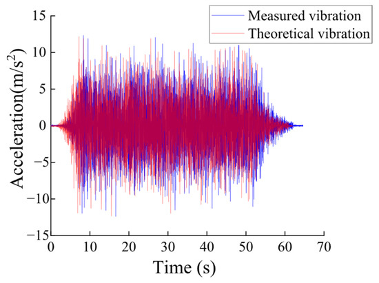 Both ends of the pipeline system are connected to the bracket by thread, and the bracket is connected to the platform of the shaking table by bolts. The brackets made of 30 mm thick steel plates welded together have sufficient stiffness to transfer the shaking table excitation to the test structure. A total of thirteen accelerometers were used to facilitate the experiment. Of them, twelve are adsorbed on the pipeline, whereas another accelerometer is adsorbed on the shaking table to monitor its acceleration time history. The acceleration seismic response measured from each point is denoted by Ai, and the subscript i represents the number of the measuring point, i = {1:13}. The accelerometers, which were used in the testing process and manufactured by Bruel and Kjaer, have a measurement range of ±100 m/s2 and a factory calibration accuracy of ±2% at a 99.9% confidence level. The theoretical acceleration signals of the shaking table were compared with the measured vibration data from point A13 (located at the geometric center of the shaking table surface), as shown in Figure 5.