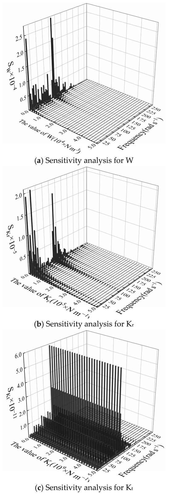 As revealed in Figure 7, the SW and SKr have similar trends: there is a maximum value near 110 rad/s, which approaches 0 as the parameter value is on the rise. SW and SKr also show large value within 25 rad/s, indicating that the measured data in this region were greatly affected by noise. SKt is noticeably less than SW and SKr and is independent of the value of Kt. Thus, Kt should be removed from the updating parameters. Meanwhile, for W, which is most sensitive to VCEE, the region with low sensitivity ranges from 60 rad/s to 70 rad/s and 80 rad/s to 100 rad/s. The frequency points used for updating can be selected from this region.