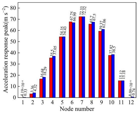 Element 8 has a larger β that conforms to the actual judgment. The comparison performed between the peak response of each node predicted by the updated model and the experimental results is shown in Figure 8.