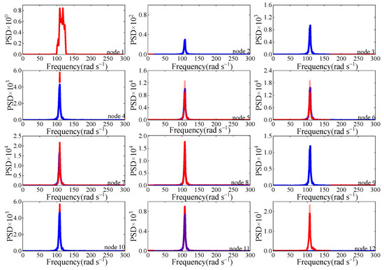 As can be seen from the figure, with the exception of A1, A2, and A12 near the supports where significant measurement noise exists, the deviations between the theoretical and measured maximum responses at all other measurement points fall within the range of 0.33% to 5%. Moreover, the location of the system’s maximum response corresponds exactly with the experimental results. Certainly, the nature of seismic response is random vibration, as a result of which the performance of the updated model needs to be validated from other aspects. Figure 8 shows the overlay of the power spectral density (PSD) curves about the relative acceleration response of each node in the experimental and updated model.