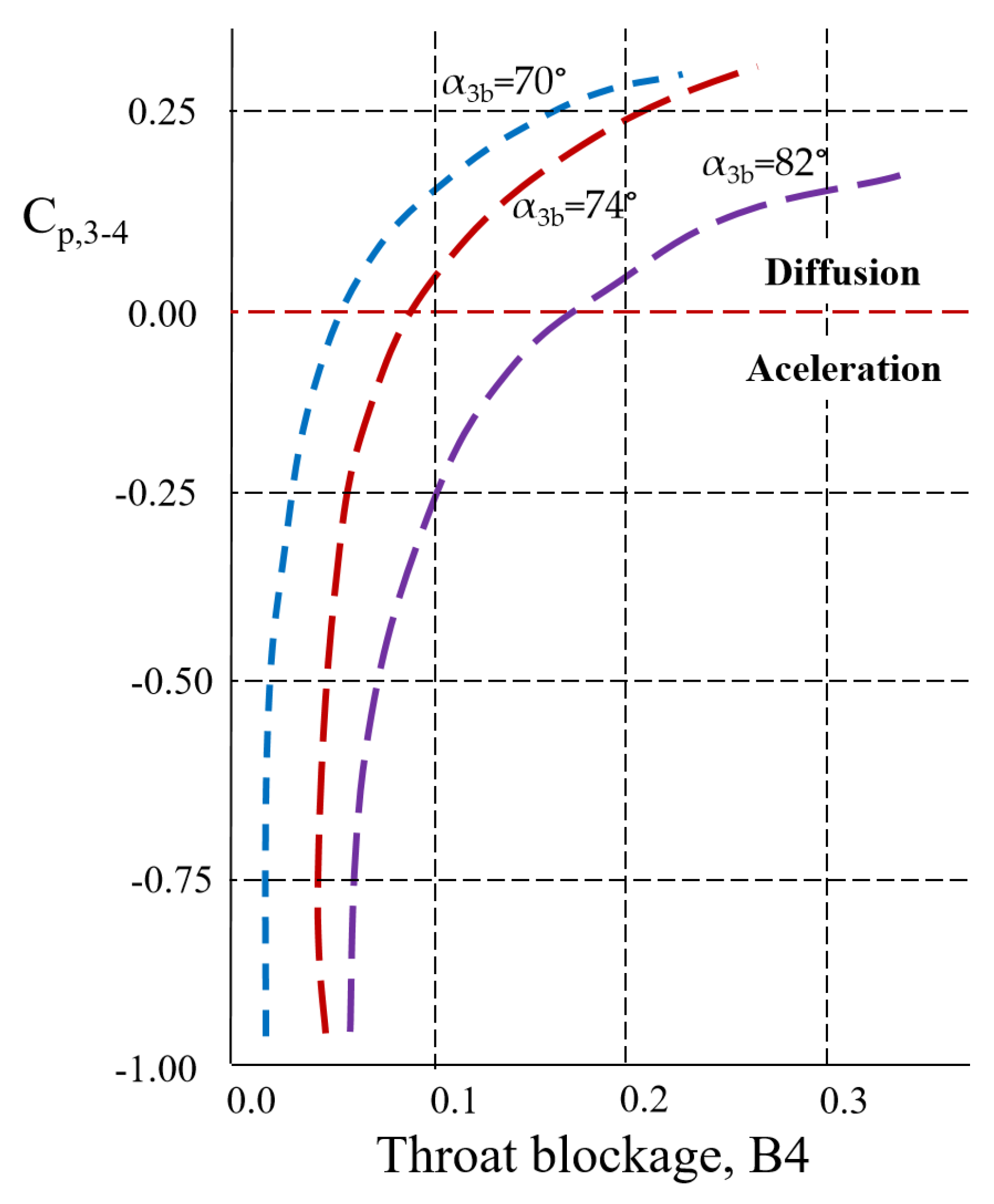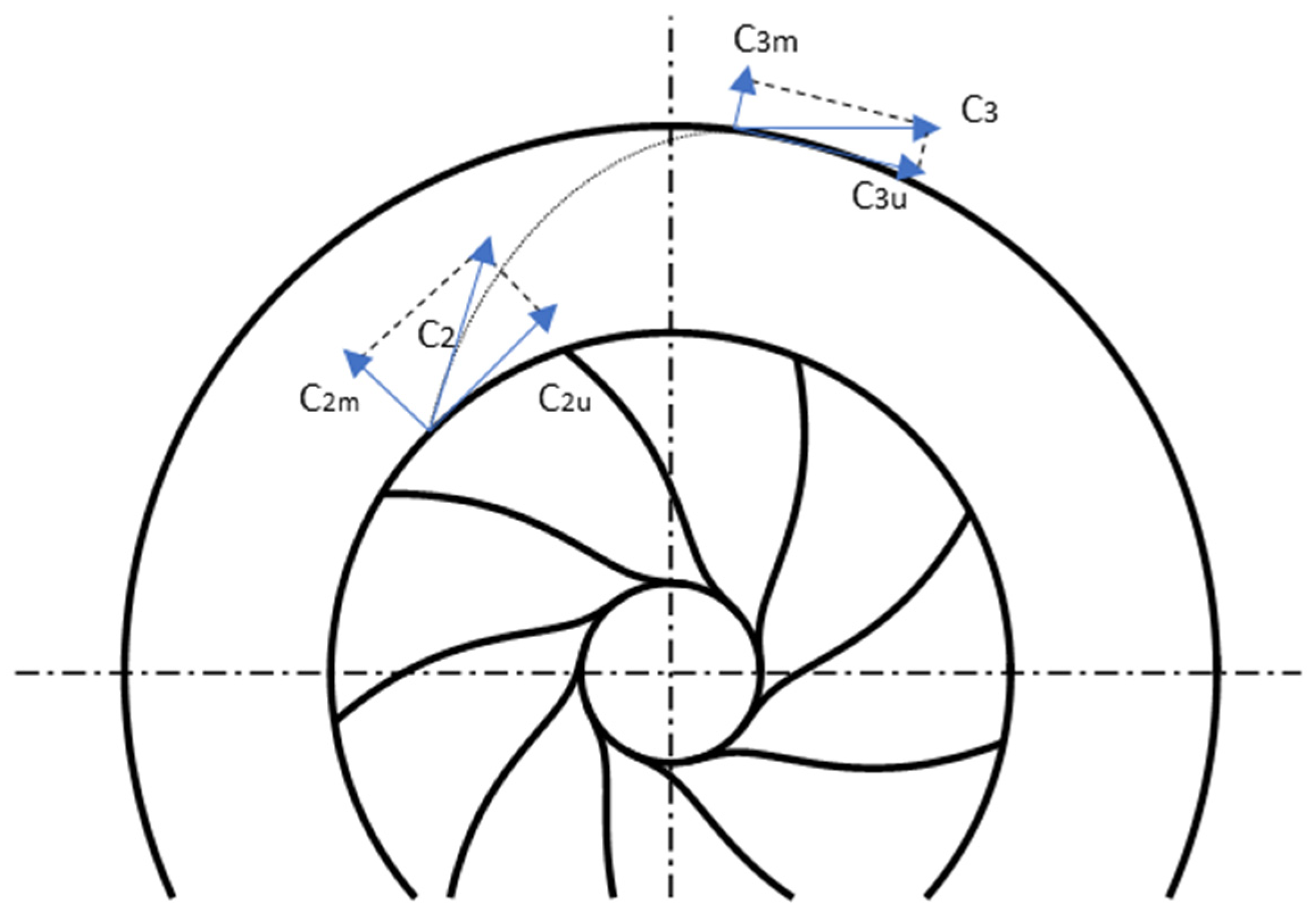 - Incidence losses—caused by the mismatch between the incoming flow angle and the vane inlet angle, which can be expressed using the flow velocity at the entrance of the diffuser (C3) and the optimum (or minimum-loss) speed defined by:in which Cm3 is the meridional velocity at the diffuser inlet, αth is the flow angle at the diffuser throat, approximated by arcsin(Ath/A3), and β3 is the blade metal angle at the diffuser inlet. The loss coefficient is given by: