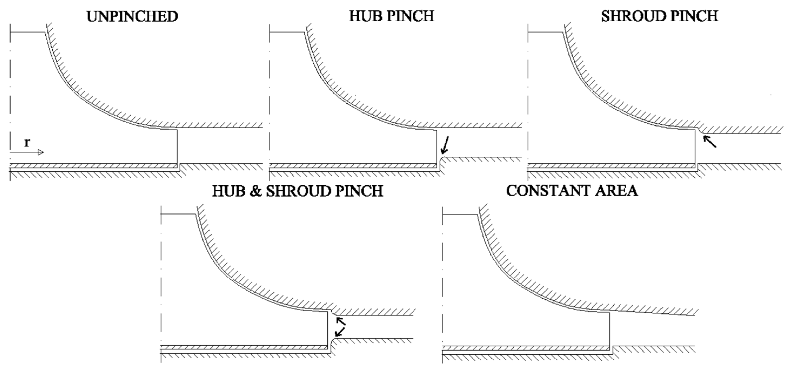 | Reduced-area tapered [18] | Gradual area reduction along radius | Improves turn-down, slightly reduces efficiency | Better part-load performance | Efficiency loss at design point |