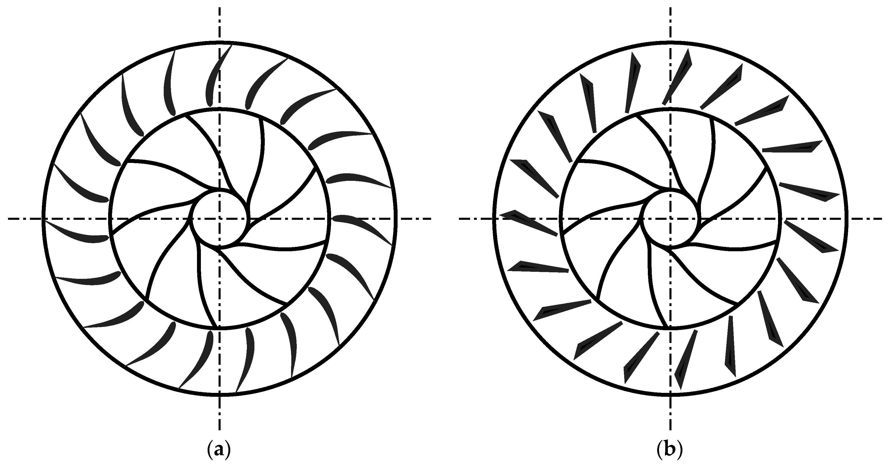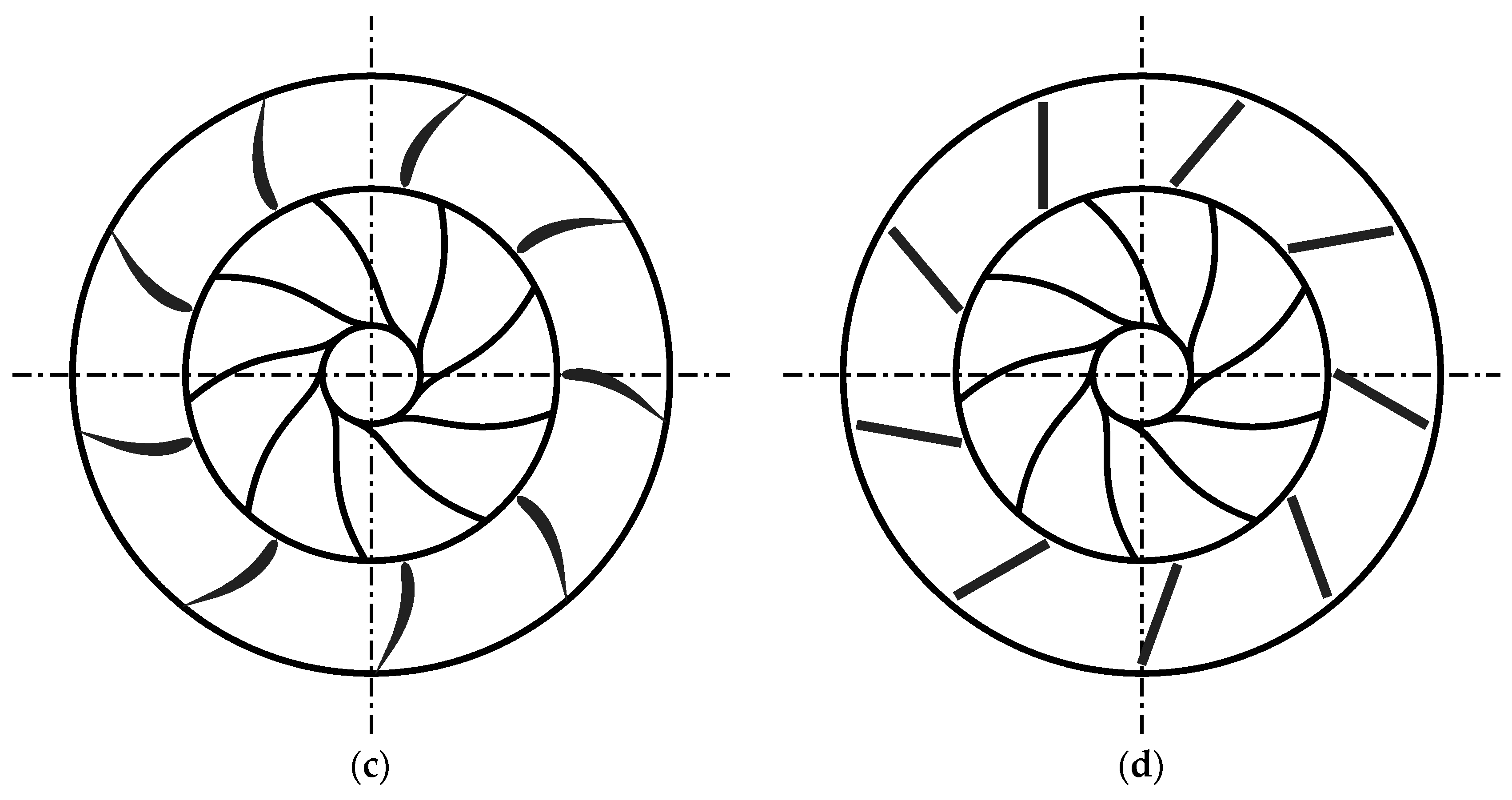 - Low-Solidity Vaned Diffusers (LSVDs), illustrated in Figure 4c, are usually a crossover between vaned and vaneless diffusers. They have geometrical properties similar to cascade diffusers, except that the blade length and number of blades are smaller than those of conventional vaned diffusers.
