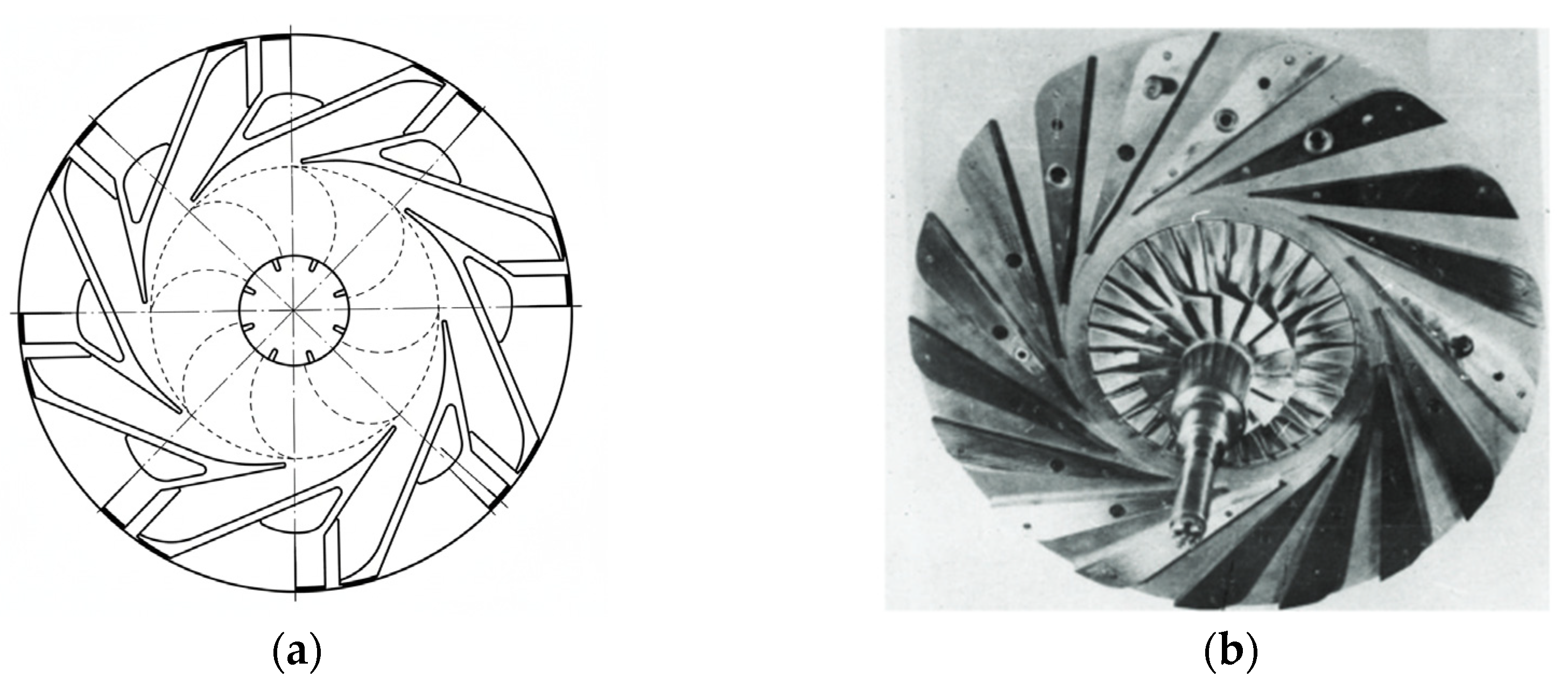 - Dixon, S.L.; Hall, C.A. Chapter 7—Centrifugal Pumps, Fans, and Compressors. In Fluid Mechanics and Thermodynamics of Turbomachinery, 7th ed.; Butterworth-Heinemann: Oxford, UK, 2014; pp. 265–317. ISBN 978-0 12-415954-9. [Google Scholar] [CrossRef]