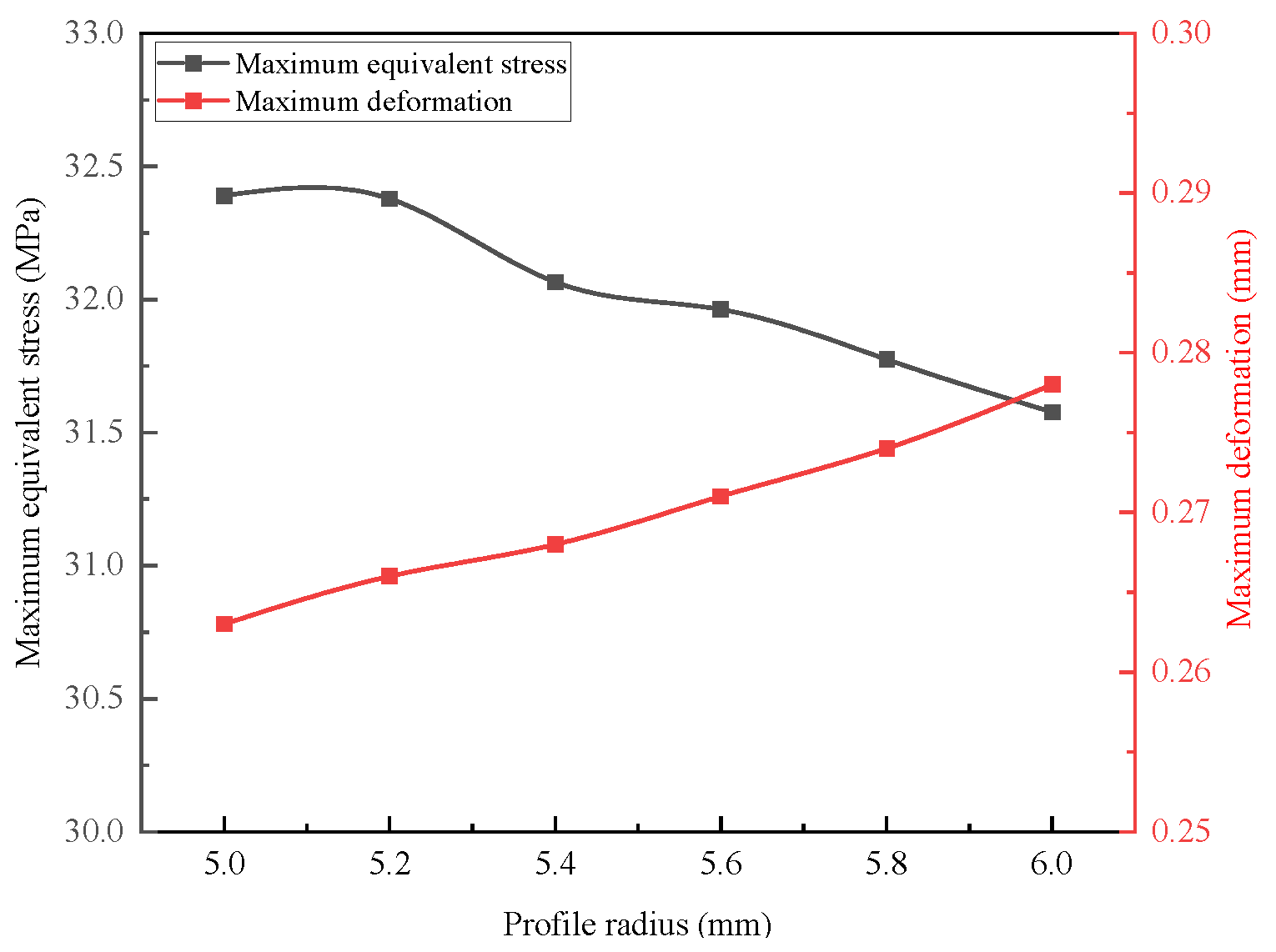 - Influence of Eccentricity on Strength: A reduction in cage eccentricity leads to a decrease in equivalent stress, while simultaneously increasing the maximum deformation of the cage. For example, when the profile radius R increases from 5.0 mm to 6.0 mm, the eccentricity decreases by approximately 27%, resulting in an approximate 2.5% reduction in equivalent stress. However, this change also leads to a maximum deformation increase of about 5.7%. These findings indicate that in the pursuit of a lightweight cage design, structural parameters should be optimized according to specific functional requirements, carefully balancing the priorities of low stress and minimal deformation in relation to cage eccentricity.