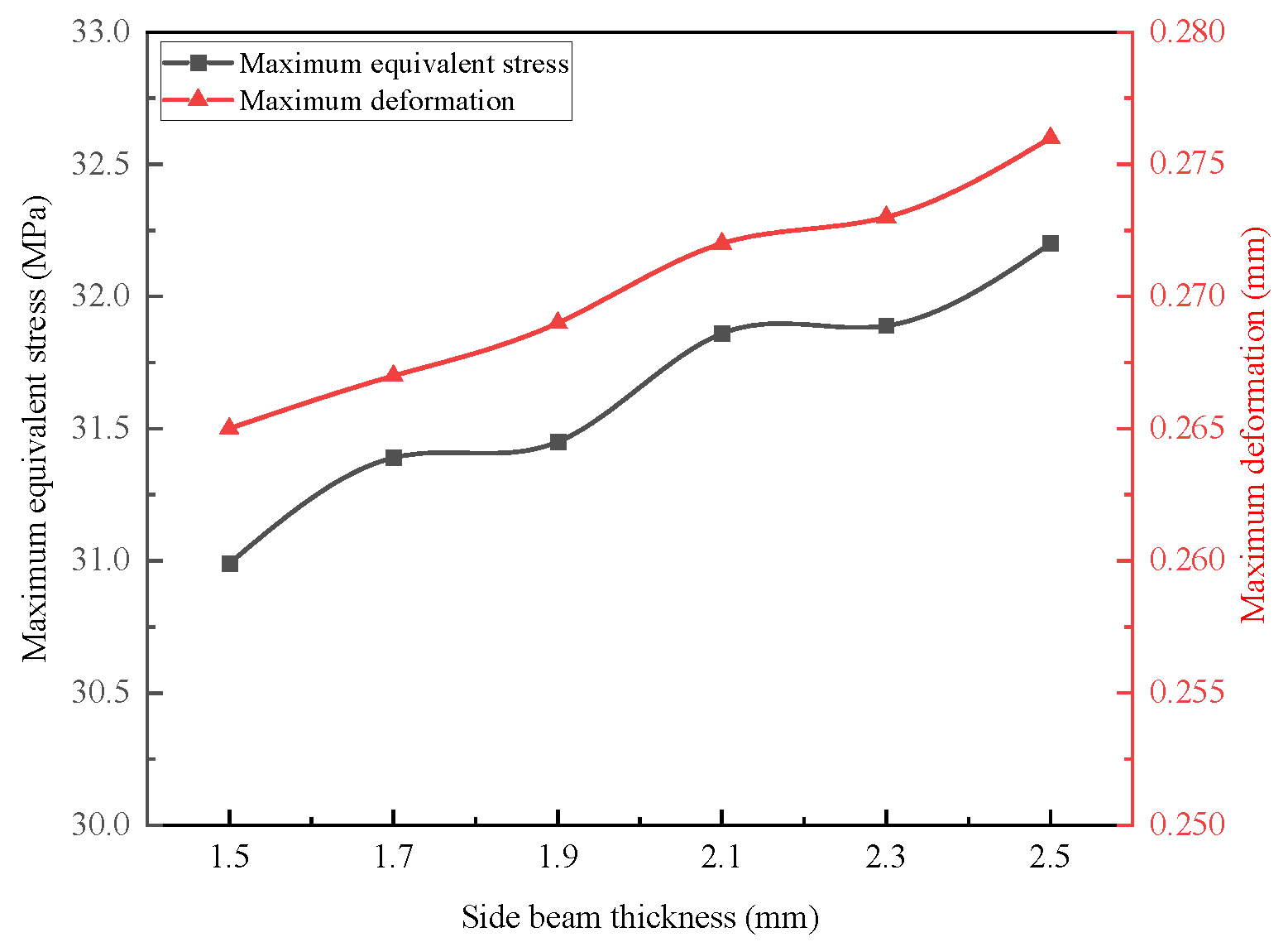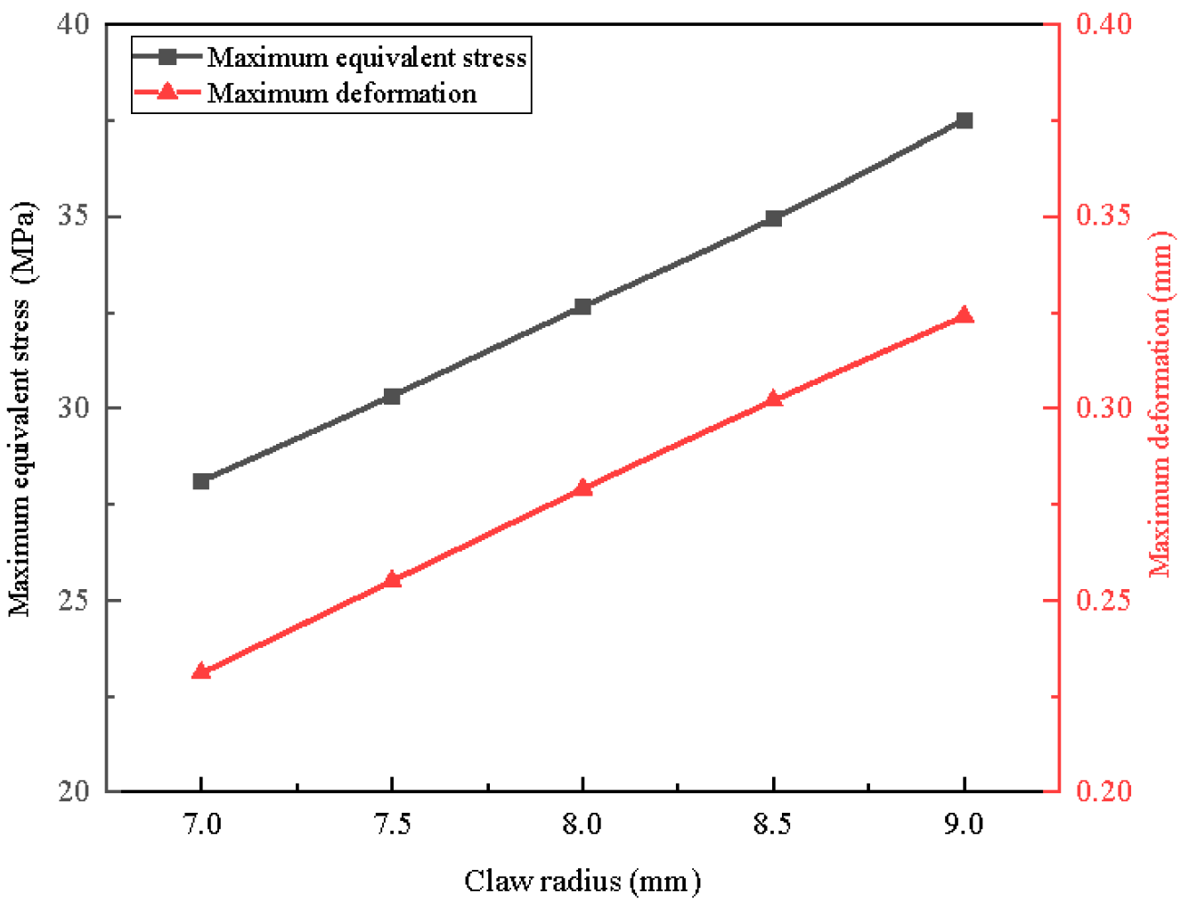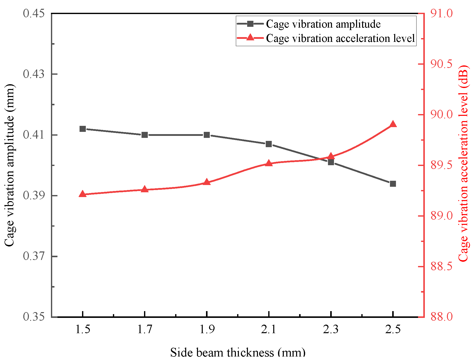 - Influence of Centrifugal Force: An analysis of the side beam thickness and claw radius indicates that the strength of the cage is significantly affected not only by eccentricity but also by the centrifugal force exerted by the cage itself. The equivalent stress is observed to increase with the centrifugal force. For instance, when the side beam thickness (H) is increased from 1.5 mm to 2.5 mm—resulting in an increase in mass and centrifugal force—the eccentricity decreases; however, the equivalent stress still rises by approximately 3.9%.