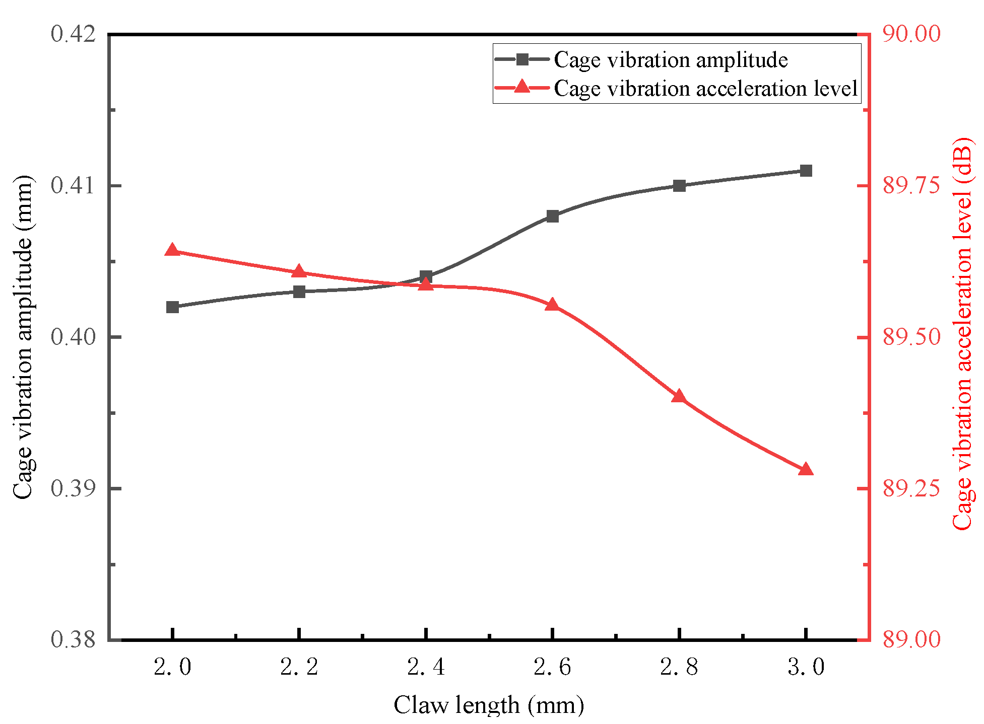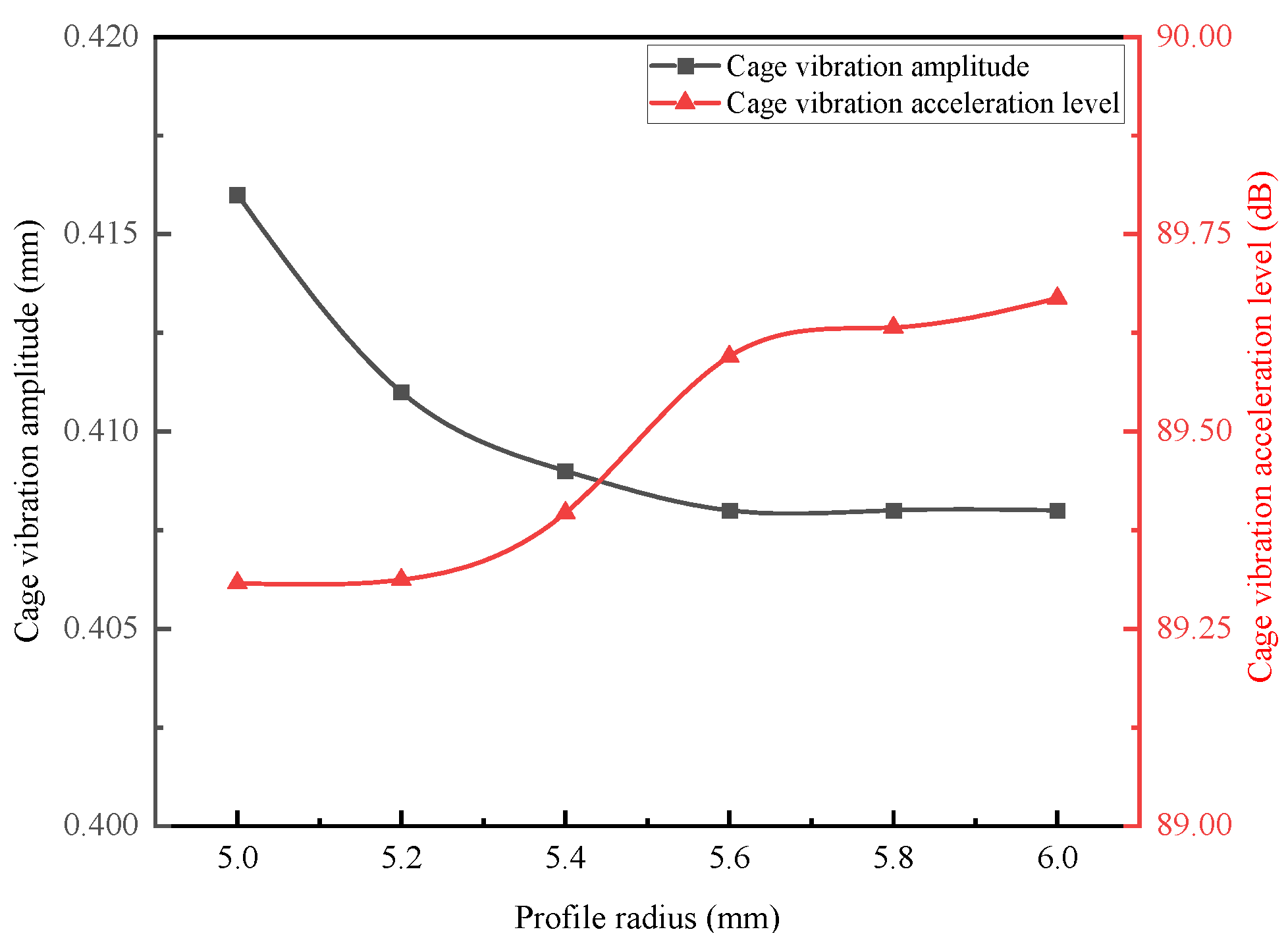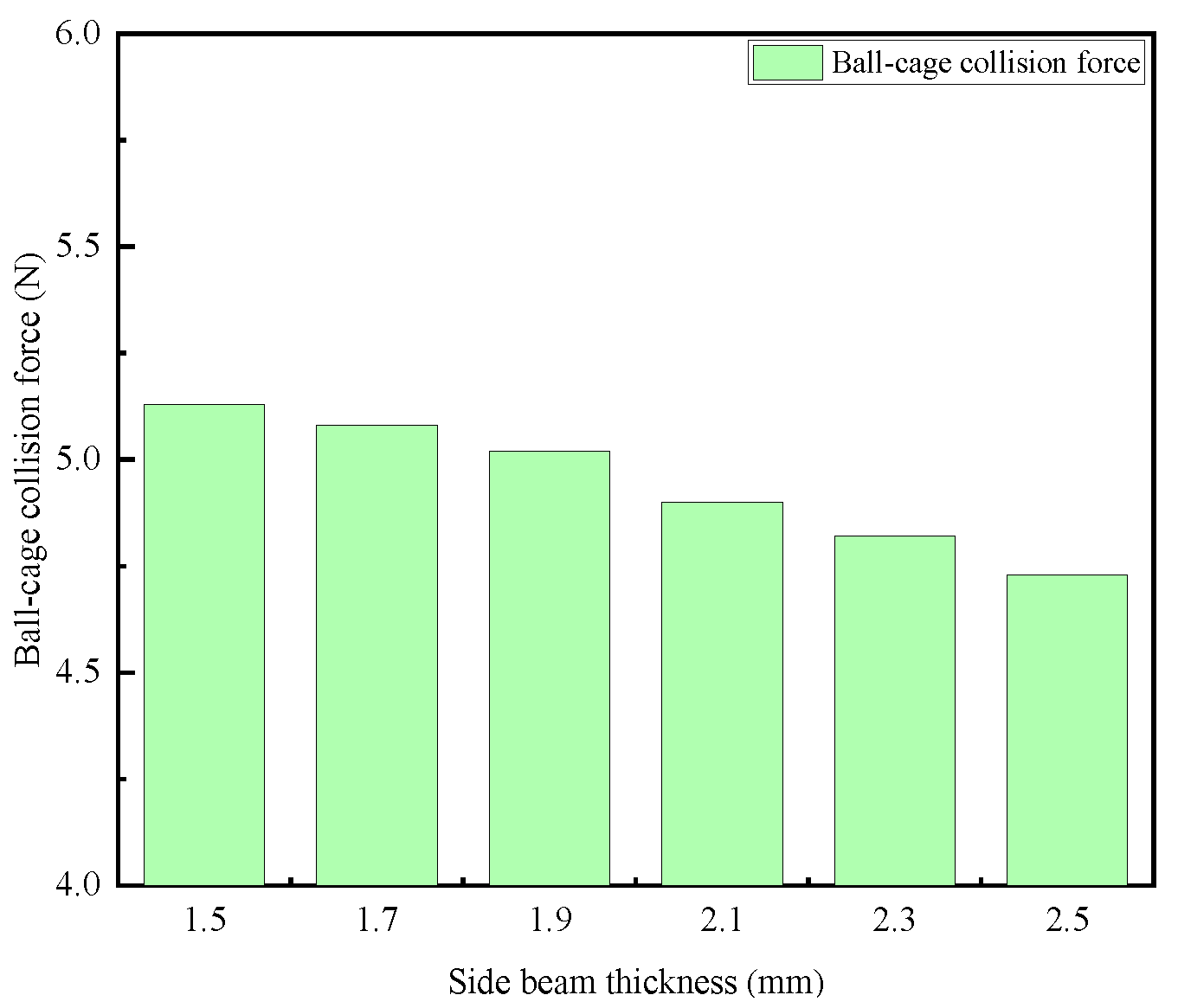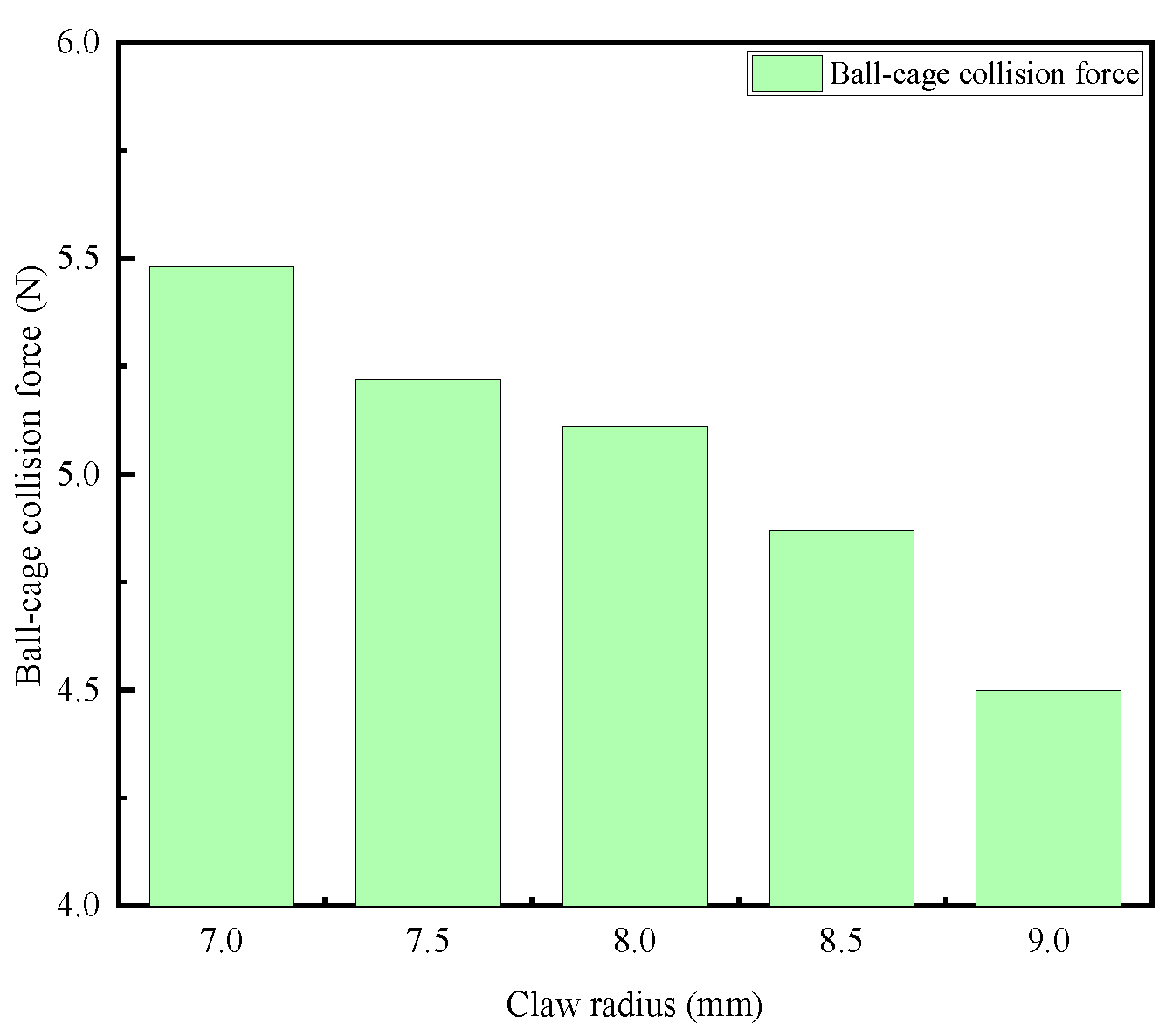 - Influence of Eccentricity on Stability: The eccentricity of the crown-type cage significantly influences its operational stability. A decrease in cage eccentricity leads to a reduction in the collision force between the balls and the cage, as well as a decrease in the cage’s vibration amplitude. However, this reduction in eccentricity also results in an increase in the vibration acceleration level due to a decrease in the additional resistance torque caused by axial asymmetry. For instance, an increase in the profile radius (R) results in the ball–cage collision force decreasing from 5.50 N to 4.71 N (approximately a 14.4% decrease), the cage vibration amplitude decreasing from 0.416 mm to 0.408 mm, and the cage vibration acceleration level increasing from 89.308 dB to 89.669 dB. Therefore, from a stability perspective, it is not necessarily true that smaller eccentricity is always better; a targeted design is required based on functional requirements, whether aiming for lower collision force/amplitude or lower vibration acceleration.