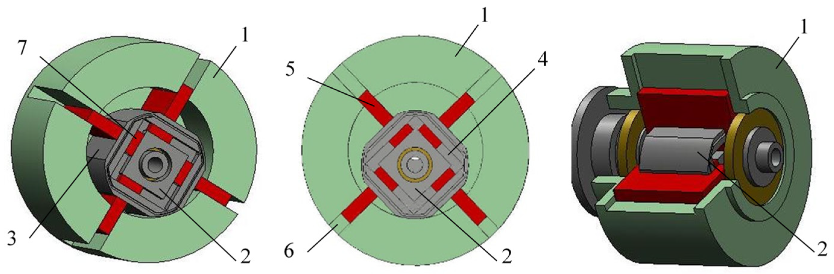 Figure 3 illustrates the general layout of a two-stroke BRICE. The engine consists of a cylindrical block with an integrated eccentric axis. On the eccentric journals of this axis, rotation supports are mounted, which carry the housing. Inside the housing, a rotor is positioned. The housing contains radial grooves in which sliders are installed with the ability to move radially. On the outer surface of the rotor, flat faces are formed in the areas where it contacts the sliders, and tangentially aligned rectangular grooves are machined parallel to these faces. Sliders, which are integrated with the shutters, are able to slide tangentially within these grooves. The space between the housing and the rotor forms sealed working volumes.