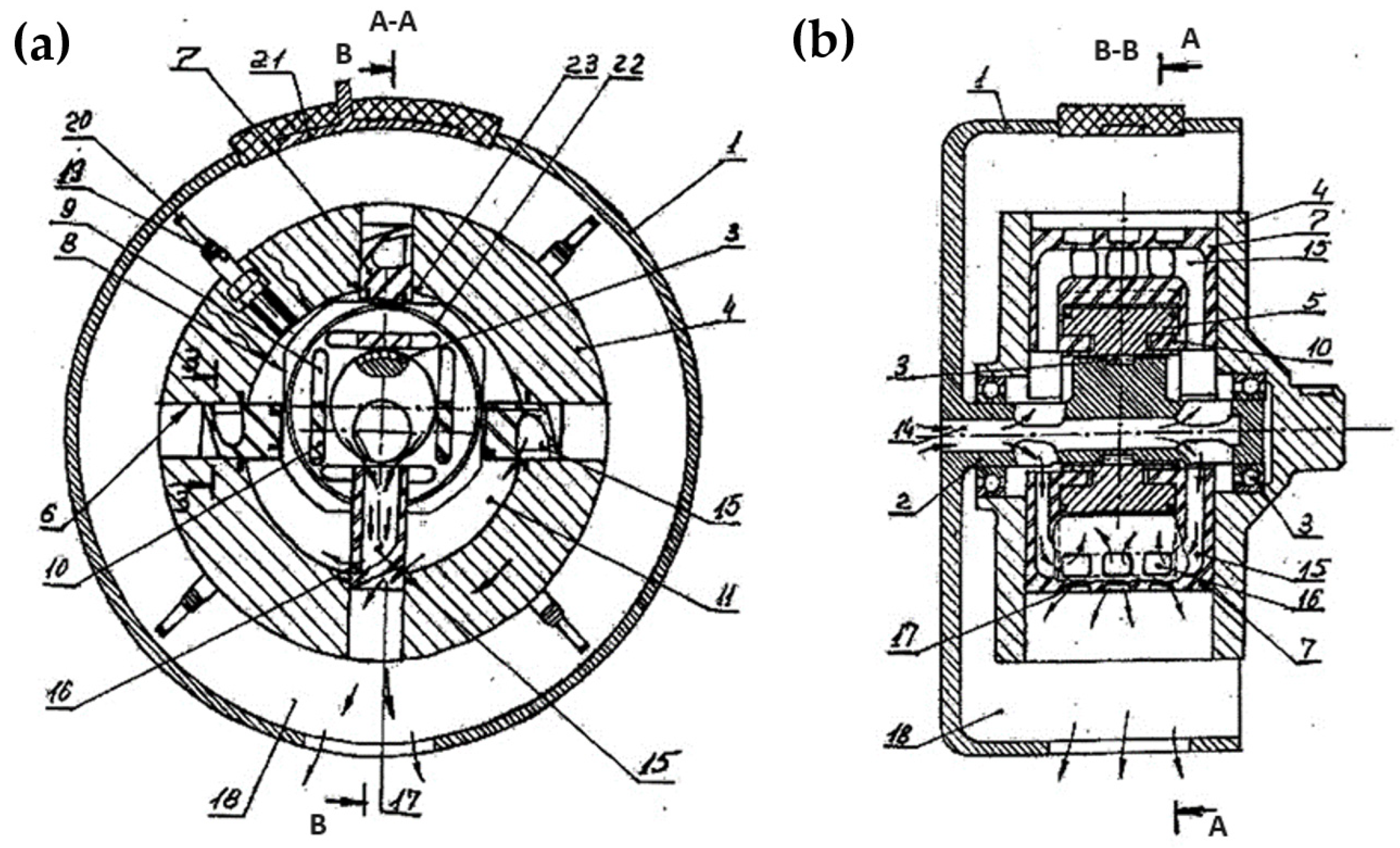 Figure 2) features a mechanism in which an axis with two eccentric journals—offset relative to each other—remains stationary. Each journal serves as the rotational axis for the housing (1) and the rotor (2), respectively. The housing is a cylindrical shell enclosed at both ends with side covers. The rotor, located inside the housing, has flat end faces (3) and parallel grooves (4) on its ends. The cavity between the housing and the rotor is divided into sealed working chambers by shutters (5), which are installed in radial grooves (6) of the housing and connected to the rotor via sliders (7). Torque is extracted from the rotating housing. For the BM to operate, a minimum of two shutters is required, while the maximum number is theoretically unlimited.