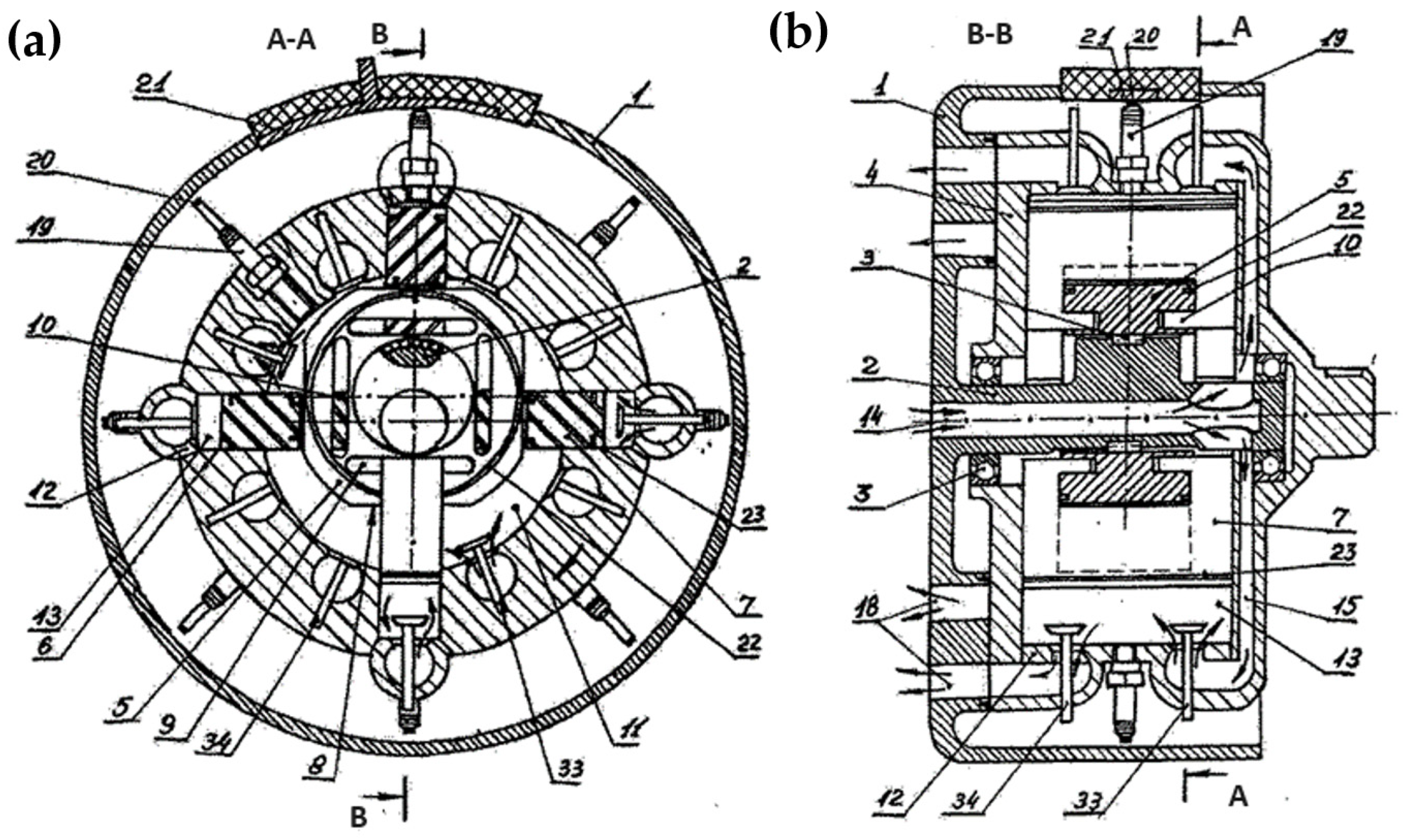 19], in place of conventional piston compressors commonly used in vehicles, offers significant advantages. These include a 3–5-fold reduction in weight and dimensions, and a 2–3-fold decrease in cost. Research conducted by the authors has shown that piston compressors suffer from several drawbacks: large mass and volume, high vibration levels, and excessive power consumption. These issues stem from the inherent design of crank mechanisms, which involve reciprocating motion of heavy components, leading to substantial inertial loads and imbalance. Reducing vibration in such systems is a complex engineering challenge, often requiring major design modifications aimed at balancing these inertial forces.