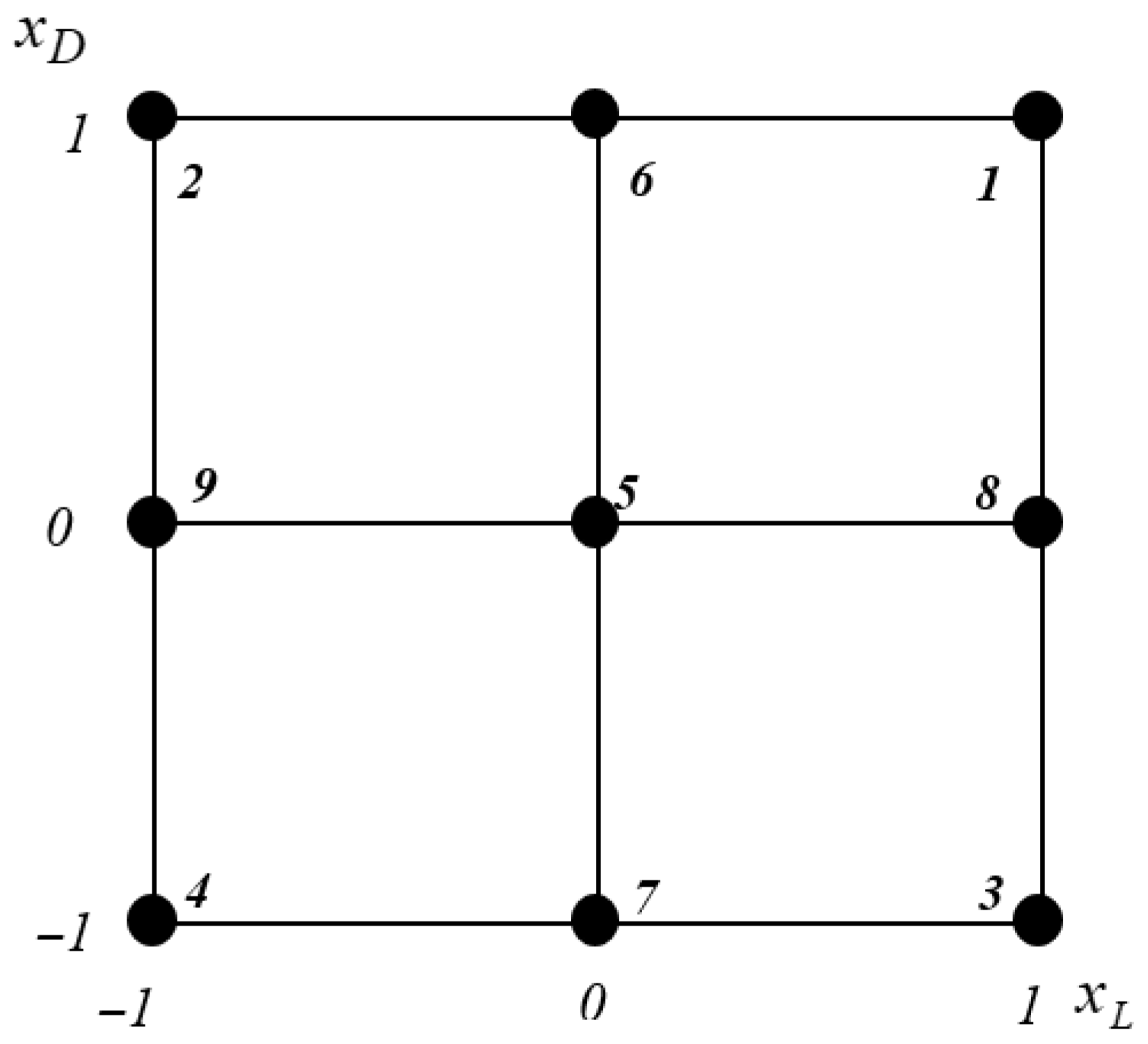 - Based on the planning matrix ( Table 4- ), a second-order orthogonal experimental design was developed for two controlled variables, each varied at three levels.  Figure 6-  provides a graphical representation of this second-order orthogonal plan, corresponding to the mode designations in  Table 4- . This design enables a systematic and statistically robust investigation of the influence of key parameters on the performance of birotor compressors.