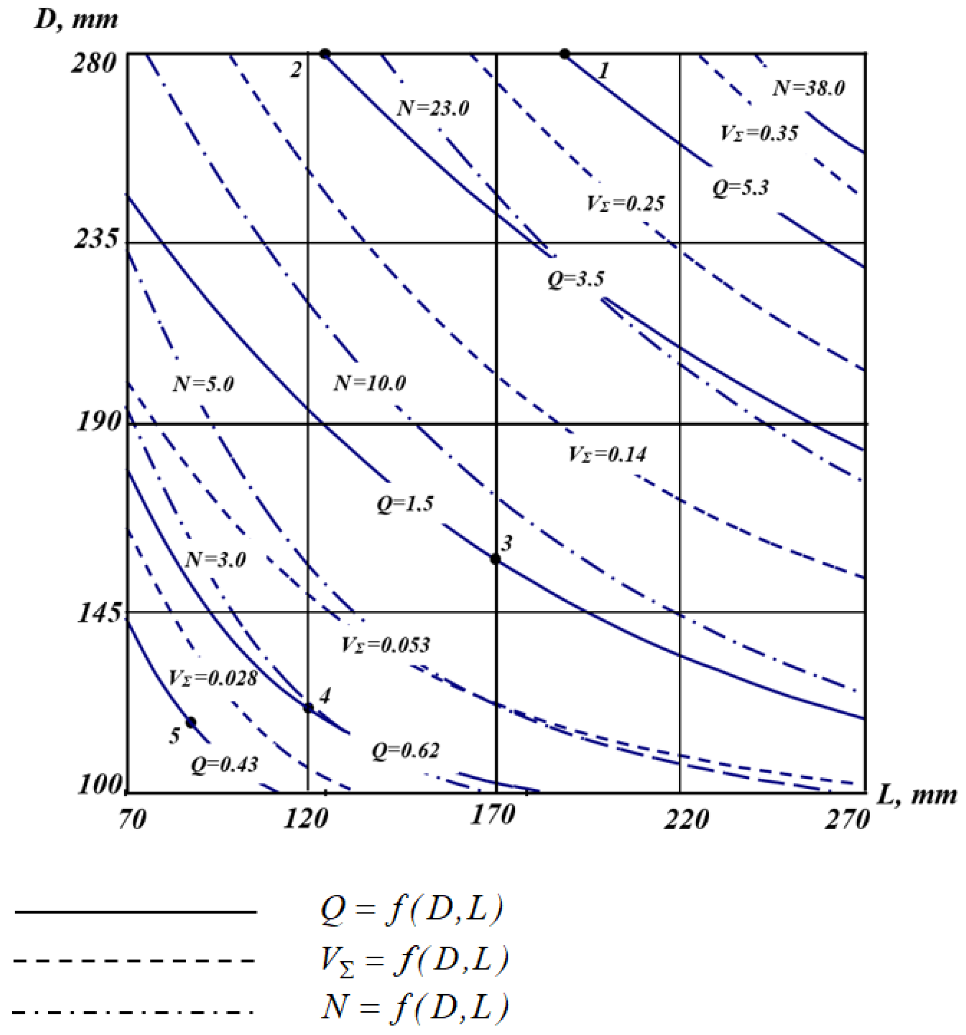 Points 1, 2, 3, 4, 5 correspond to the parameters of working BC cameras (D, L), which ensure the performance of functional prototypes. For the convenience of comparing the indicators of BC and prototypes according to mass-dimensional indicators and power consumption per drive, along with isolines of fixed productivity values Q = f(D, L) are drawn isolines VΣ = f(D, L) and N = f(D, L). In this case, the visible points on the graph (1, 2, 3, 4, 5) were selected on the corresponding isolines to reach the lowest value of the constructive volume of the BC VΣ.