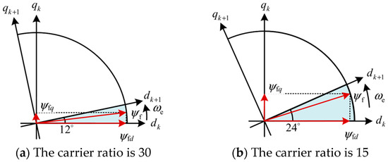 The rotor orientation error within a single control period caused by the rotor rotation effect under carrier ratios of 30 and 15 are shown in Figure 2, respectively. As shown in Figure 2, when the carrier ratio is 30, the phase difference between the d-axis and the rotor flux linkage at the end of the control period is 360°/30 = 12°, resulting in a small component of the PM flux linkage on the q-axis. When the carrier ratio is 15, the phase difference increases to 360°/15 = 24°, this leads to a significantly larger component of the PM flux linkage on the q-axis. This indicates that at lower carrier ratios, the rotor rotation effect aggravates the coupling between the machine’s excitation and torque components. Employing conventional deadbeat predictive current control under these conditions will inevitably lead to substantial prediction and control errors, adversely affecting the dynamic and static performance of the machine, and potentially causing system instability.