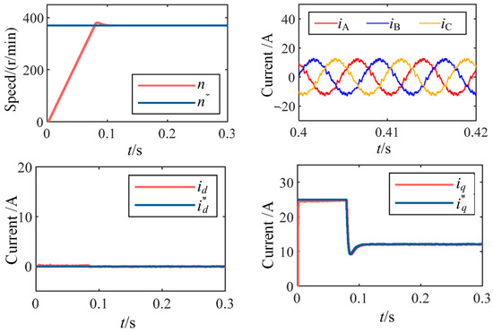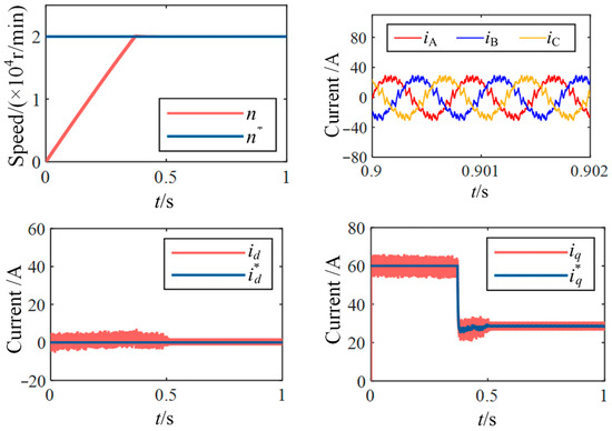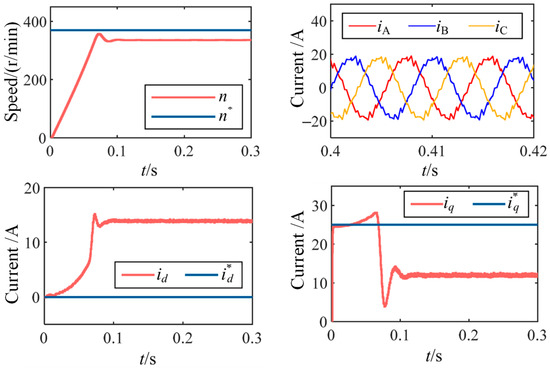 A simulation model for PMSM drives was established using the MATLAB/Simulink R2020a platform. The parameters of the target PMSM and the controller are listed in Table 1. The simulation results under improved deadbeat control with a carrier ratio of 15 (370 r/min, control frequency of 2 kHz) are shown in Figure 6.