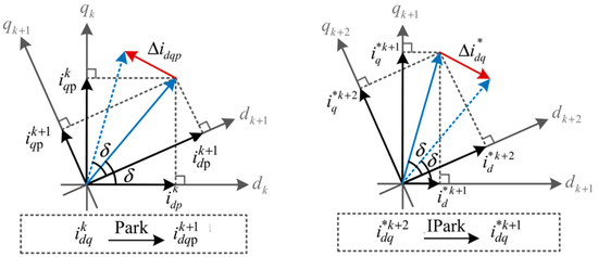 Similarly, the output from the speed outer loop corresponds to the commanded excitation and torque current components at time k + 2. Owing to controller discretization and rotor movement, directly using these values to compute the commanded voltage would cause coupling between the excitation and torque components. Therefore, the commanded current values in the dq-coordinate system at time k + 2 must be synchronized back to the dq-coordinate at time k + 1 using an inverse Park transformation. Otherwise, a commanded current error Δ will occur, as shown in Figure 4. Equation (11) gives the synchronization formula for the commanded current.
