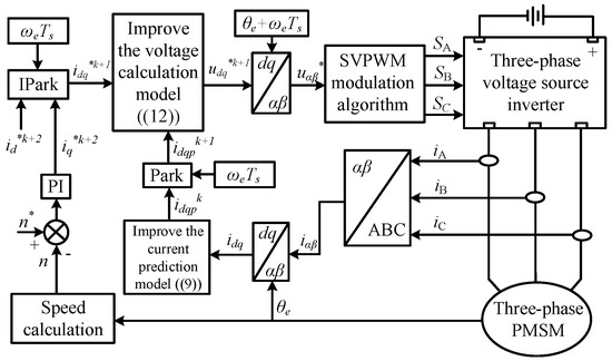 Building upon the improved voltage equation and the multi-coordinate variable synchronization method, the proposed deadbeat predictive current control effectively addresses errors caused by rotor flux linkage orientation deviation and cross mathematical space calculations involving variables from multiple coordinate systems. It achieves accurate deadbeat predictive current control suitable for both high and low carrier ratio conditions. The system block diagram of the improved DPCC strategy is shown in Figure 5.