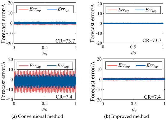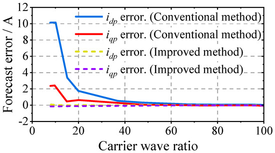 A comparison of the d and q axis current prediction errors under two deadbeat predictive current control methods at different carrier ratios is presented in Figure 7. The prediction error is calculated using the following formula (taking the average value over 1 s in steady state).