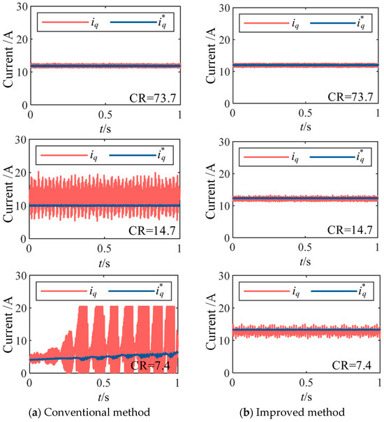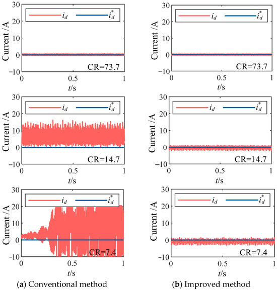 To verify the effectiveness of the proposed algorithm, steady-state experiments under different carrier ratios were conducted using both conventional and the proposed methods. The machine was maintained at the rated speed of 370 r/min, with control frequencies set to 10 kHz, 2 kHz, and 1 kHz, corresponding to carrier ratios (CR) of 73.7, 14.7, and 7.4, respectively. The comparative waveforms of the d and q axis currents under conventional DPCC and improved DPCC algorithms are shown in Figure 10 and Figure 11, respectively. It can be observed that at higher carrier ratios, both conventional and improved DPCC exhibit satisfactory tracking performance for the d and q axis currents. As the carrier ratio decreases, the d and q axis currents under the conventional method gradually deviate from the reference values and even oscillate severely, leading to a complete loss of control. In contrast, the proposed method maintains accurate tracking of the reference currents without steady-state error, although the current ripple increases slightly and the pulsation of d and q axis currents slightly amplifies as the carrier ratio decreases.